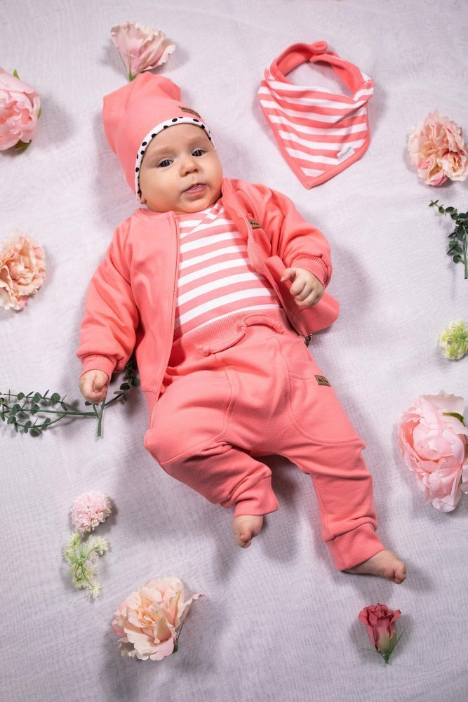 Modna czapka dresowa dla dziewczynki w kolorze koralowym. Od środka podszyta białą bawełną w czarne kropki, z niewielką ilością elastanu, co sprawia, że czapka nie odkształca się. Przód zdobi naszyta skórka.