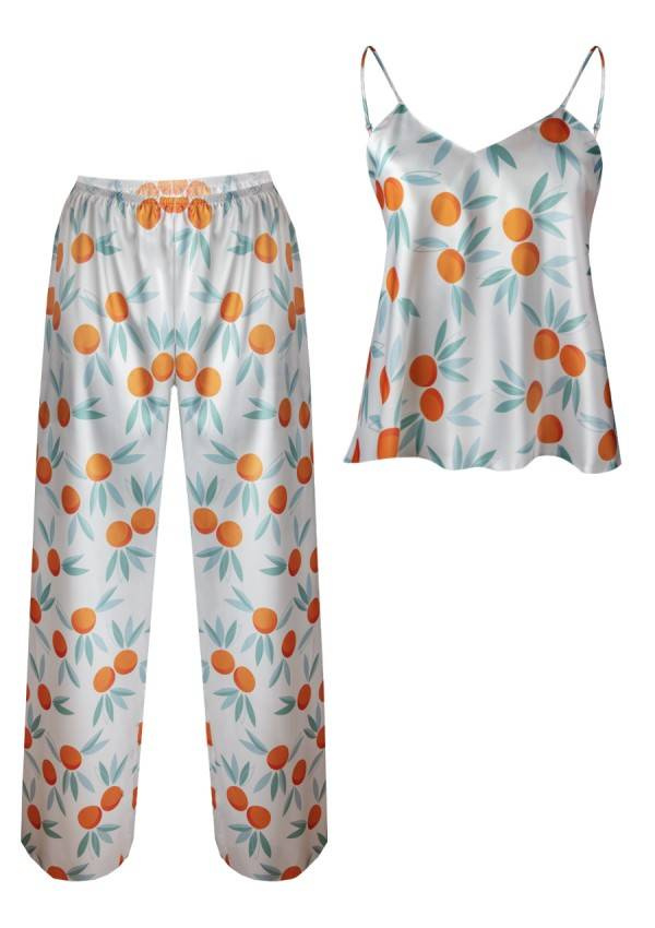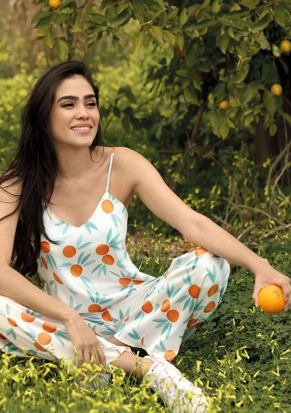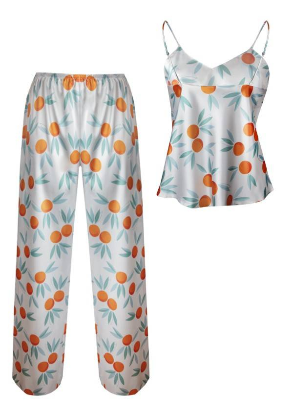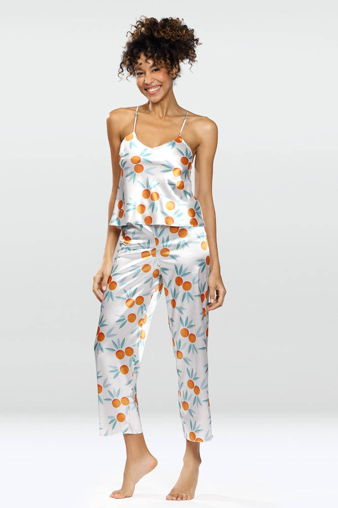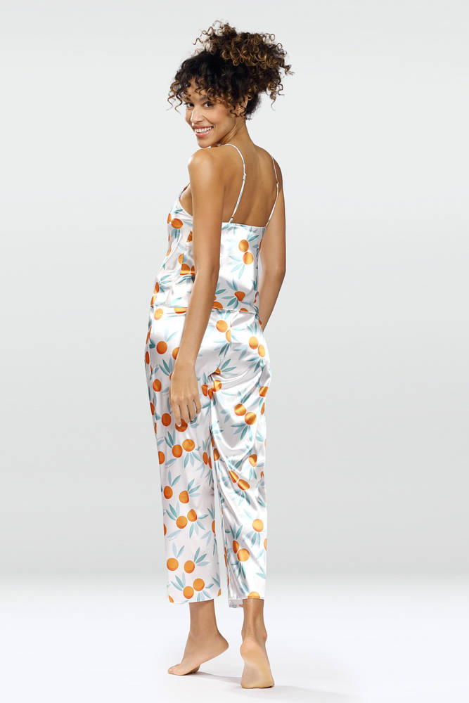 Zwiewny dotyk satyny utuli Cię do snu. Zmysłowy komplet FLOWERS składa się z koszulki oraz długich spodni. Góra koszulki posiada dekolt w kształcie litery "V". Dół kompletu wykończona zwiewną satyną. Do kompletu długie spodnie satynowe na cienkiej gumce.