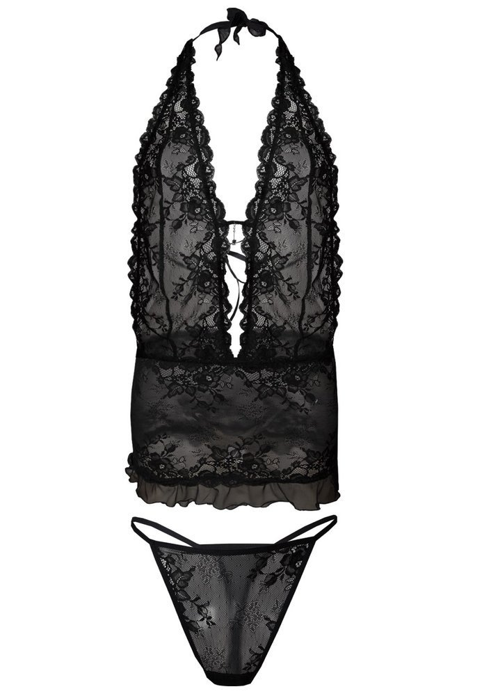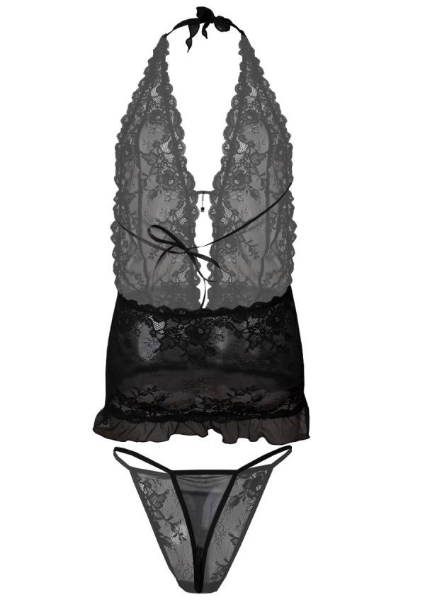 Składa się z obcisłej koronkowej koszulki oraz koronkowych stringów.