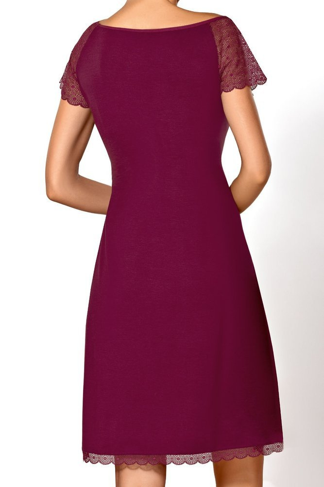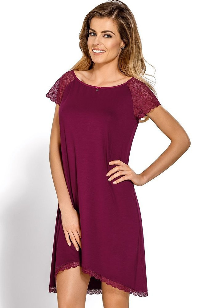 Subtelna koszulka damska wykonana z delikatnej wiskozy. Krótki rękawek wykończony efektowną koronką. Dekolt w kształcie łódeczki ozdobiony kokardką z elementem biżuteryjnym. Dół koszulki obszyty koronką, tył lekko wydłużony.