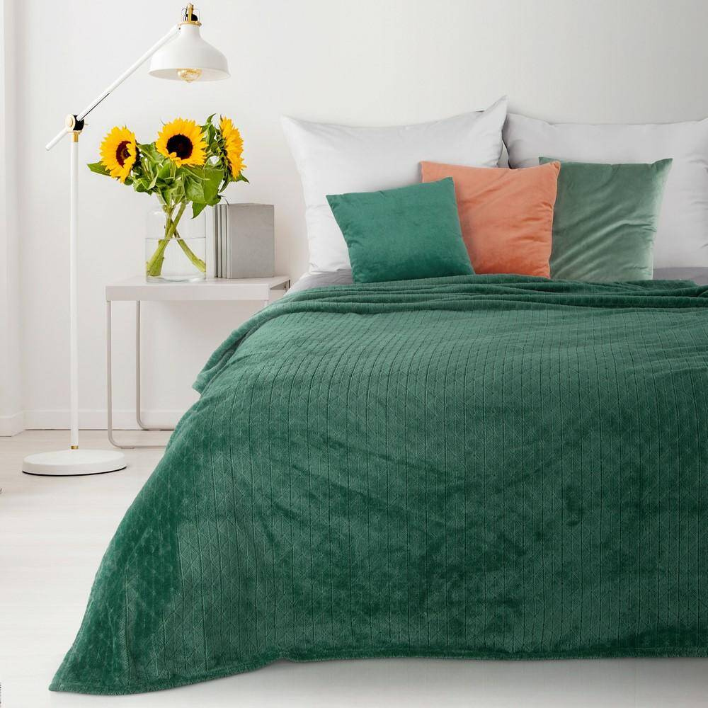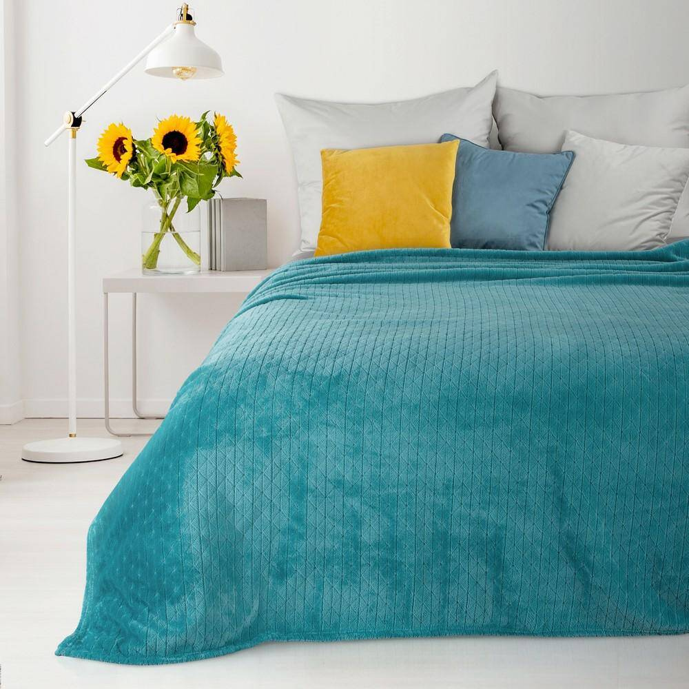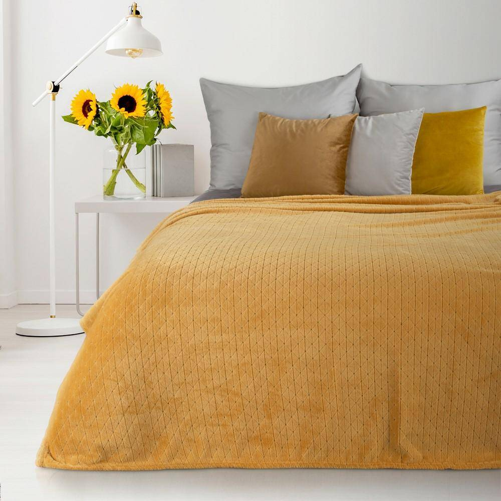 Narzuta wykonana z miękkiej i bardzo przyjemnej tkaniny. Zdobiony jasnozłotym nadrukiem z motywem ważki. Doskonały towarzysz popołudniowej drzemki i chłodnych wieczorów.  Miękkie mikrowłókno, z którego wykonany jest koc, sprawia, że tkanina jest puszysta i niezwykle przyjemna w dotyku, a także trwała. Puszysty i mięciutki koc w pięknym, kolorze ozdobiony jest w rogach subtelnym, połyskującym nadrukiem. Koc jest idealnym pomysłem na prezent.
