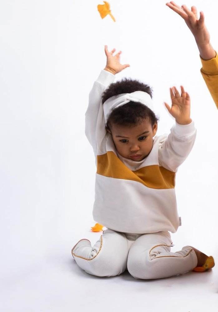 Legginsy uszyte z kremowej bawełny dresowej z domieszką elastanu, co powoduje, że materiał nie odkształca się a zarazem jest miły w dotyku. W pasie posiadają wygodną gumkę nie uciskającą brzuszka. Ubranko zdobią musztardowe lampasy, które zostały wszyte po bokach.
