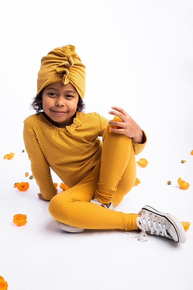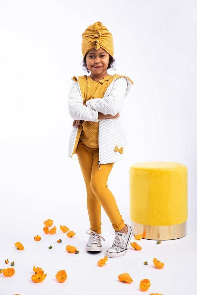 Legginsy dresowe dla dziewczynki, uszyte z musztardowej bawełny z domieszką elastanu i poliestru, co powoduje, że materiał nie odkształca się a zarazem jest miły w dotyku. W pasie posiadają wygodną gumkę nie uciskającą brzuszka. Ozdobą jest imitacja rozporka.