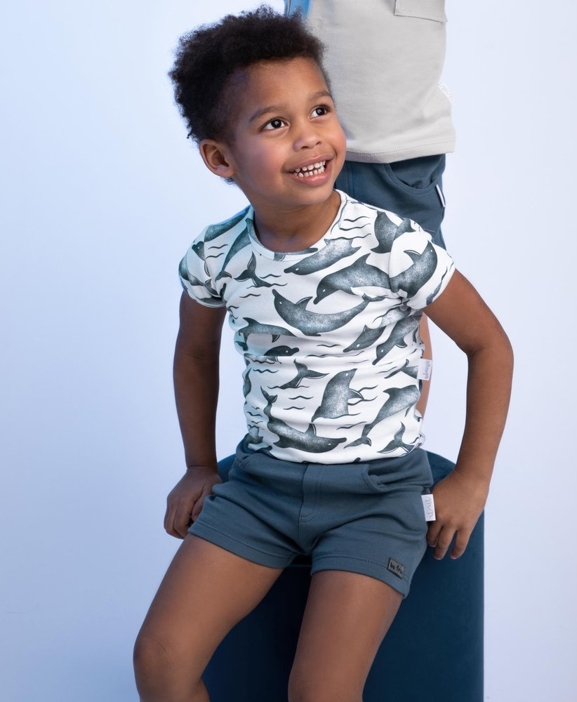 Przewiewne body z krótkim rękawem, idealne w ciepłe dni, uszyte z białej bawełny z motywem delfinów, posiadającej certyfikat Oeko-Tex Standard 100 Tekstylia godne zaufania. Ubranko posiada zakładany fason, małe rozmiary rozpinane są z boku oraz w kroku na napy, od rozmiaru 68 do 98 cm ubranko zapinane jest na ramieniu zapewniając komfort przy ubieraniu.