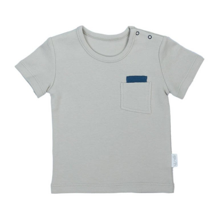 Gustowna bluzeczka z krótkim rękawem z beżowej bawełny. Ubranko posiada praktyczne napy na ramieniu ułatwiające ubieranie, dodatkowo zdobi je imitacja kieszonki w morskim kolorze. Materiał posiada certyfikat Oeko-Tex Standard 100 Tekstylia godne zaufania.