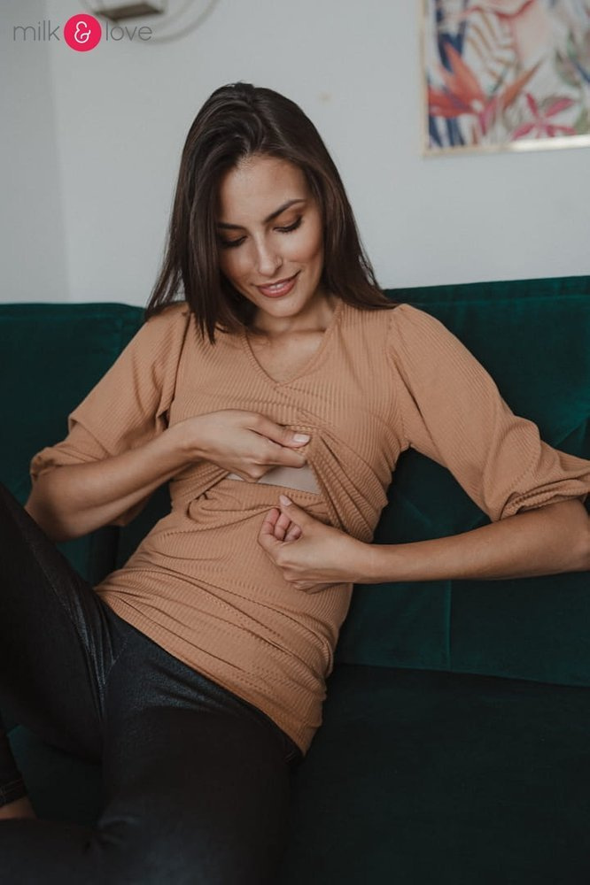 Bluzka ciążowa Milky Puff najpierw otuli ciążowy brzuszek a dzięki dopasowanemu krojowi i materiałowi w prążek piękni go podkreśli. Po porodzie, dzięki sprytnemu rozwiązaniu typu "pętelka", wygodnie nakarmisz w niej maluszka piersią - wystarczy jedną ręką odchylić warstwę materiału. Piękne, lekko bufiaste rękawy dodają bluzce niepowtarzalnego uroku!