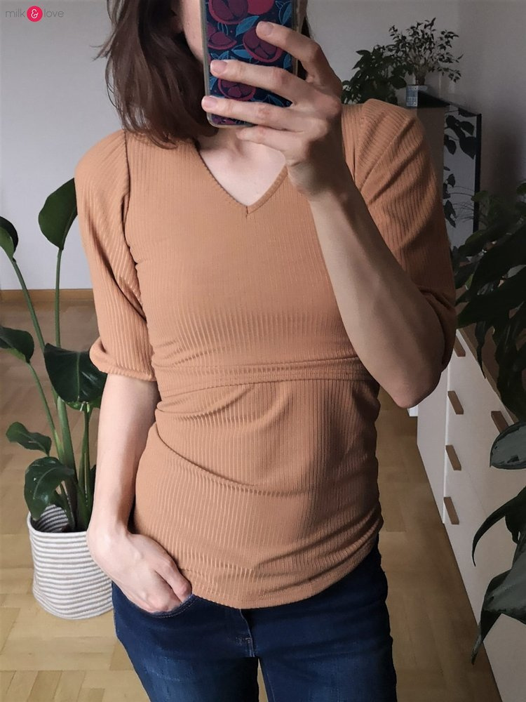 Wybierając rozmiar bluzki Milky Puff na czas ciąży - wybierz rozmiar większą niż zwykle nosisz.