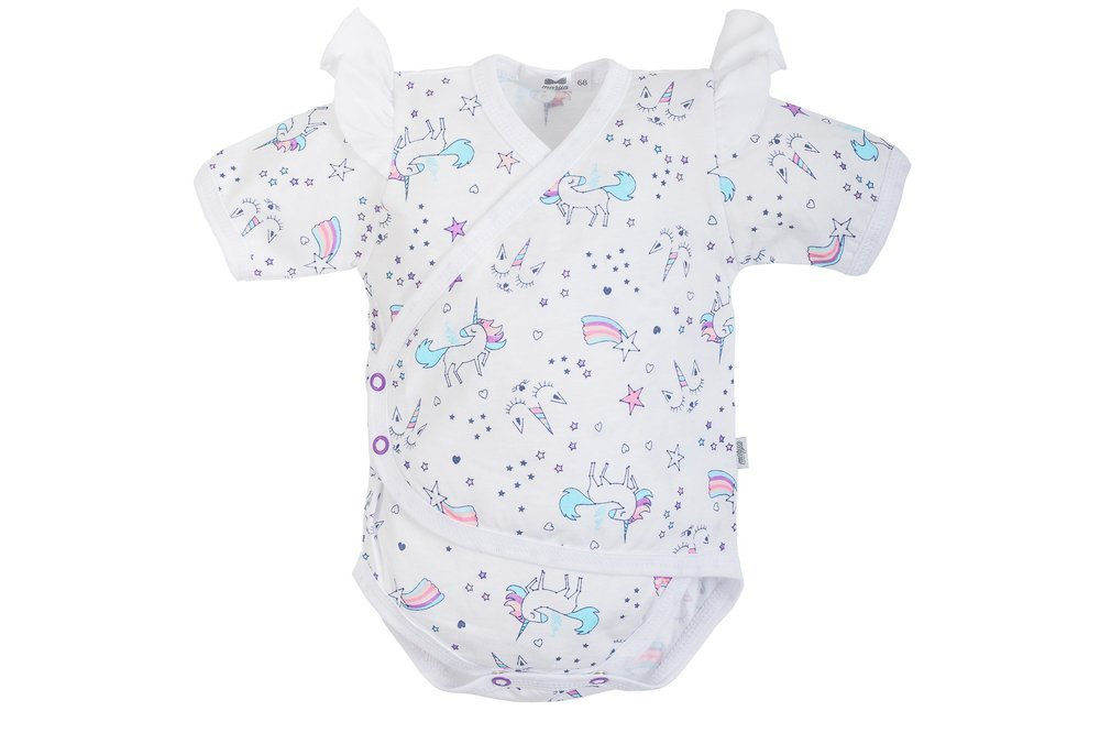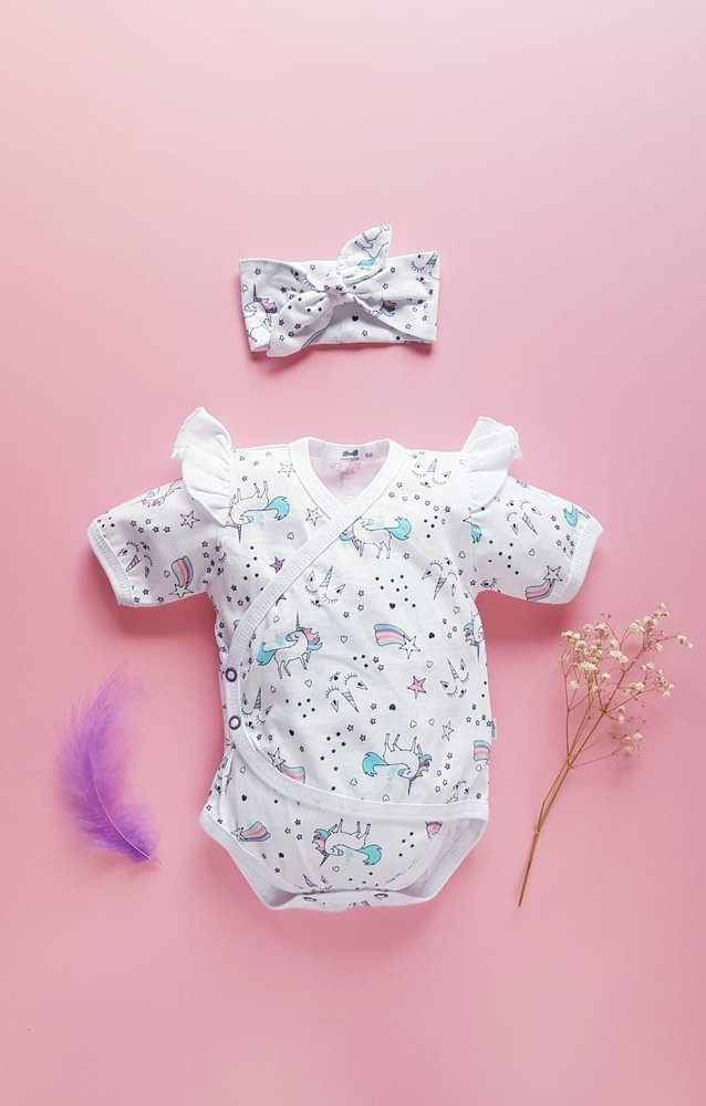 Niezwykle praktyczne i wygodne rozpinane body z krótkim rękawem. Wykonane z mięciutkiej bawełny. Ozdobione falbankami przy rękawkach. Zapinane na bezniklowe napki.