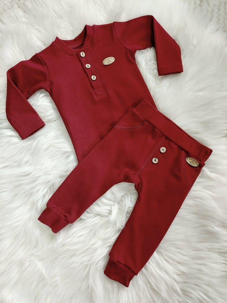 Spodnie dziecięce z trzema imitującymi drewno guzikami. Wygodny, nieuciskający ściągacz w pasie, utrzymuje spodenki na odpowiednim miejscu, w każdej sytuacji. Świetnie sprawdzą się w domu, na spacerze i podczas wyjazdów. Anatomiczny krój sprawia, że nie krępują ruchów dziecka podczas nauki raczkowania czy chodzenia. Warto o nich pamiętać kompletując wyprawkę dla maluszka. Idealnie pasują do body Mieszko.