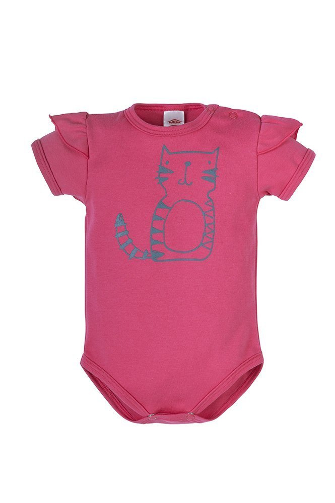 Przewiewne body z krótkim rękawem, idealne w ciepłe dni, uszyte z białej bawełny z motywem kotka, posiadającej certyfikat Oeko-Tex Standard 100 Tekstylia godne zaufania. Ubranko posiada zakładany fason, małe rozmiary rozpinane są z boku oraz w kroku na napy. Produkt zdobi granatowa lamówka.