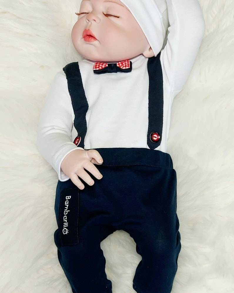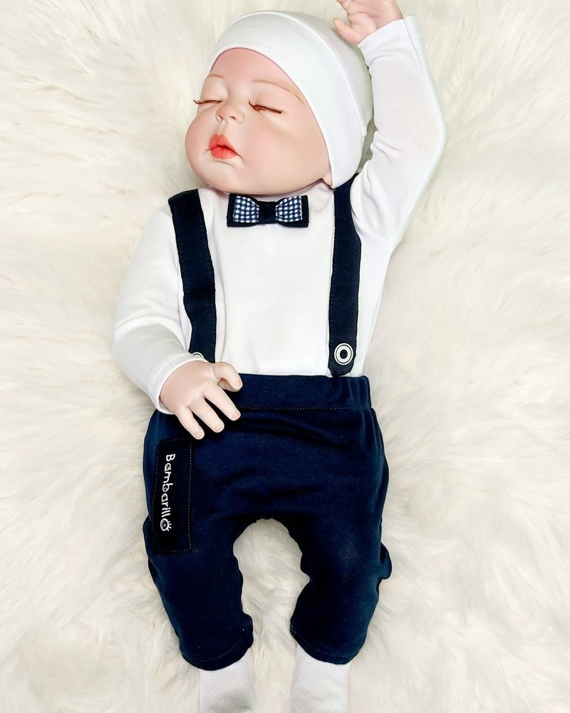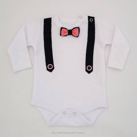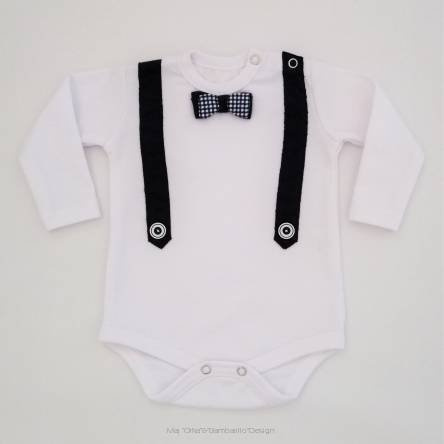 Przód body zdobią szelki z guziczkami oraz podwójna muszka.