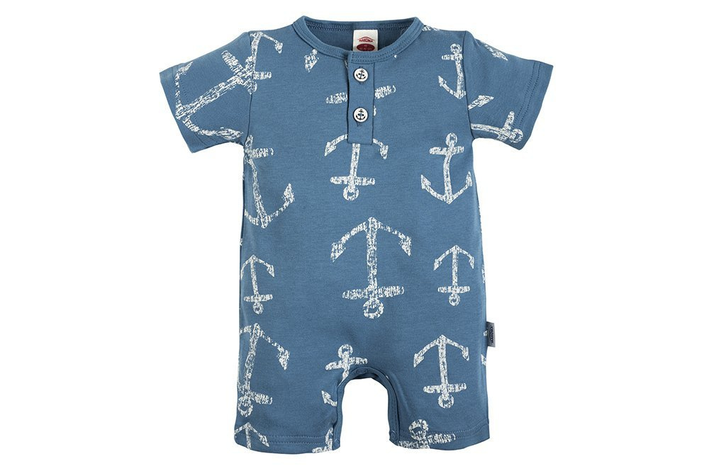 Doskonały w ciepłe dni, rampers dla chłopca dziewczynki z motywem kotwicy. Posiada krótkie rękawki i nogawki, przy szyi obszyty lamówką. Wygodne napy na ramieniu i w kroku ułatwiają przewijanie maluszka. Uszyte ze 100% bawełny posiadającej certyfikat Oeko-Tex Standard 100 Tekstylia godne zaufania.