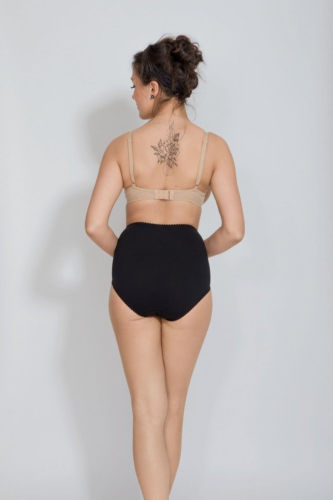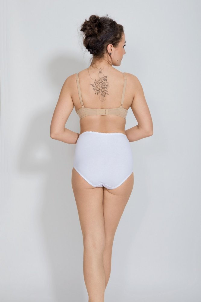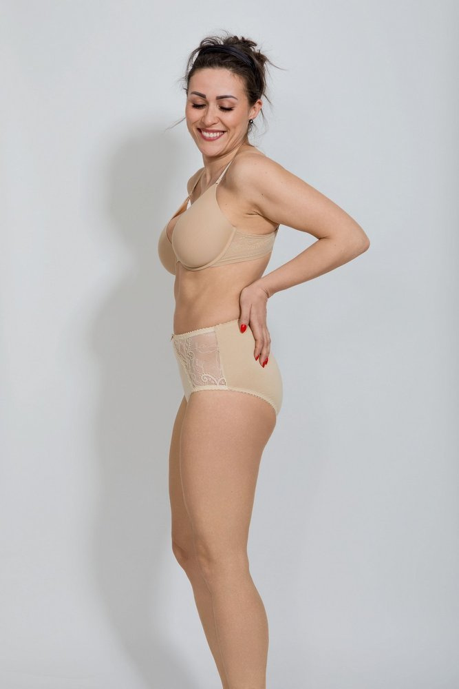 Figi damskie z wysokim stanem oraz zabudowanymi bokami wykonane z gładkiej bawełny i ażurowej koronki.