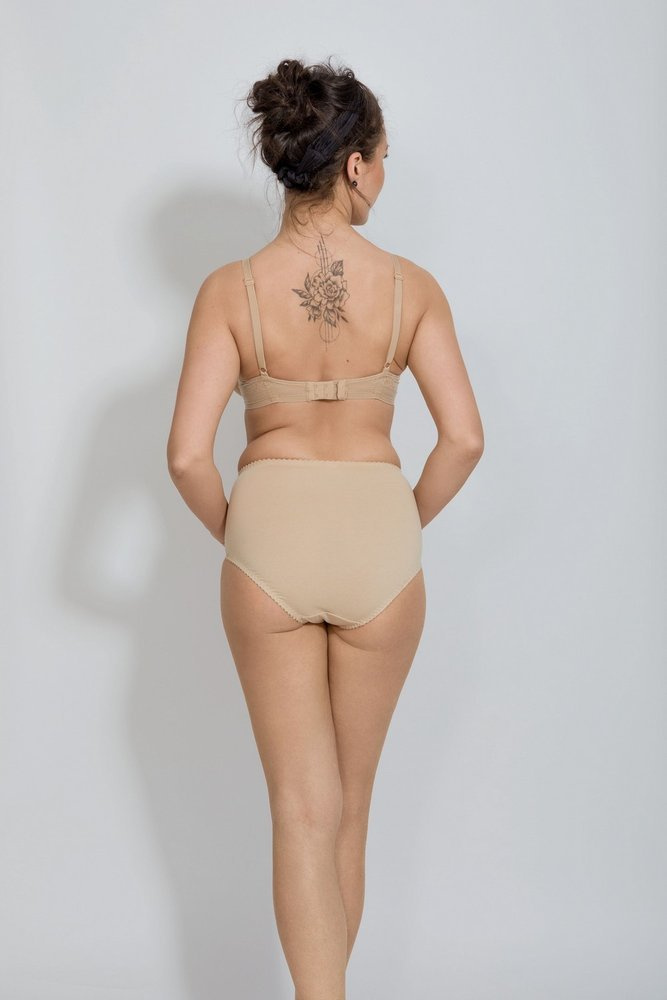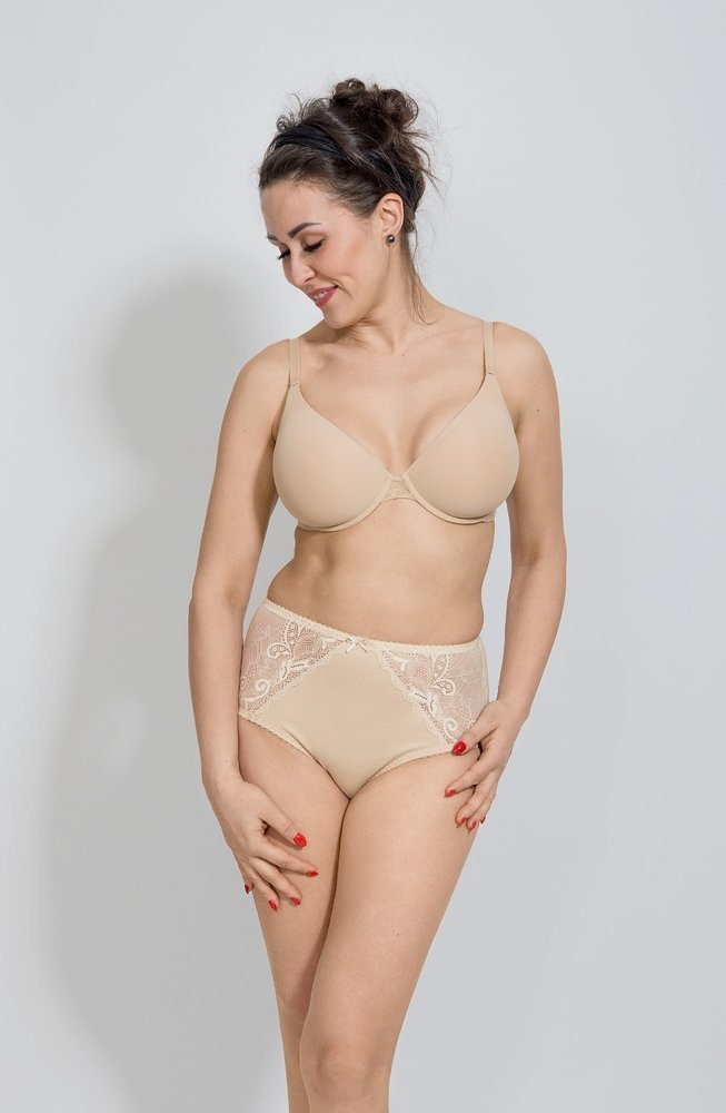 Figi damskie z wysokim stanem oraz zabudowanymi bokami wykonane z gładkiej bawełny i ażurowej koronki.
