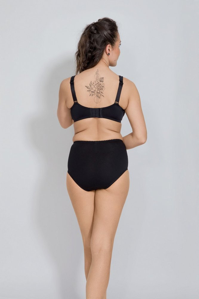 Figi damskie z wysokim stanem oraz zabudowanymi bokami wykonane z gładkiej bawełny i ażurowej koronki.