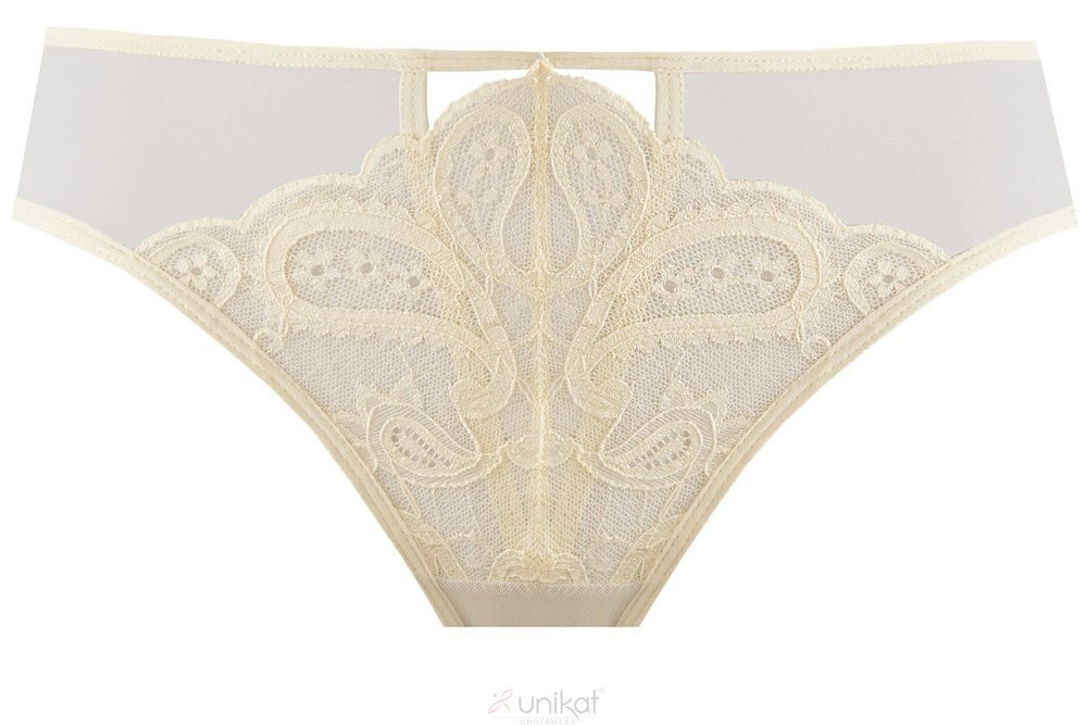 Figi wykonane z zmysłowej koronki i mikrofibry, które dopełnia bogato zdobiona koronka.