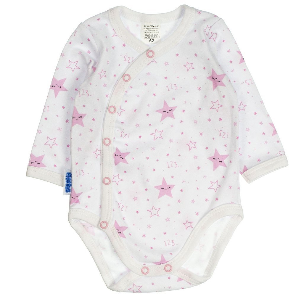 Body wykonane ze 100% bawełny. Ozdobione nadrukiem w gwiazdki. Na ramionku i w kroczu zapinane na napki. Body rozpinane to niezbędny element wyprawki dla noworodka.