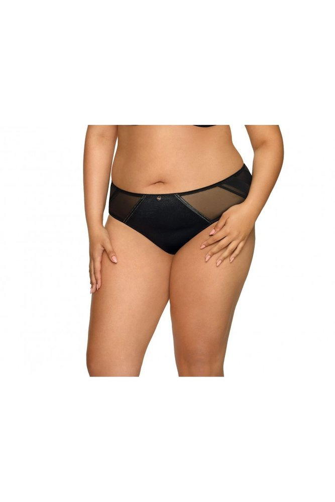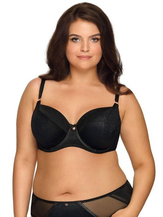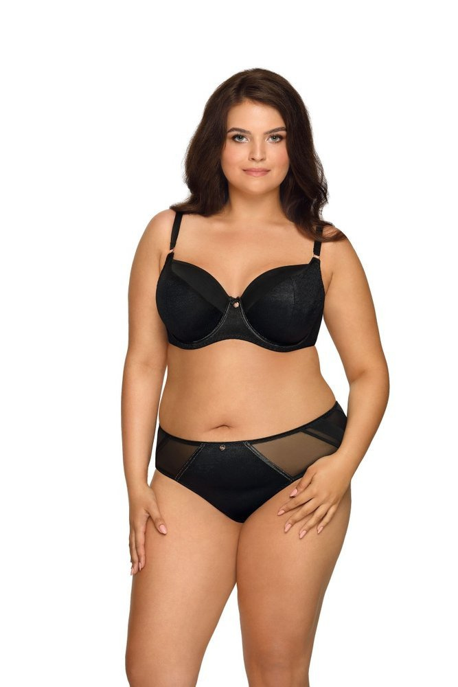 Klasyczna elegancja ubrana w szlachetną czerń wzbogaconą odrobiną blasku to esencja AV 1920. Biustonosz typu full cup doskonale zbiera piersi ku sobie, nadając im pożądany kulisty kształt. Lekko połyskliwa, elastyczna dzianina pokrywająca dolne partie misek i mostek została uzupełniona w górnej części pasiastą tkaniną. Czarne satynowe taśmy wszyte złotą nicią na tunelach podkreślają dolną linię biustu, a metalowe dodatki w kolorze rose gold dopełniają i rozjaśniają efektowną całość.