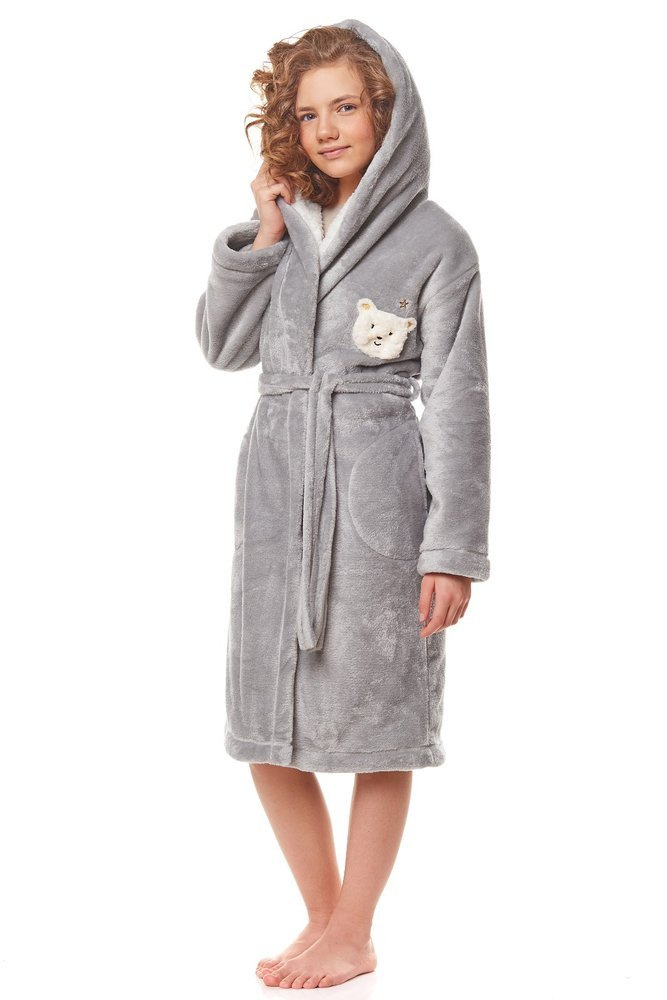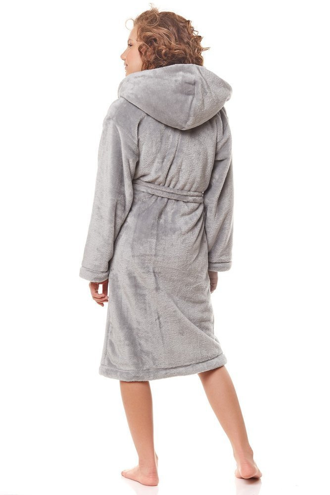 Szlafrok posiada kaptur oraz możliwość wiązania w pasie.