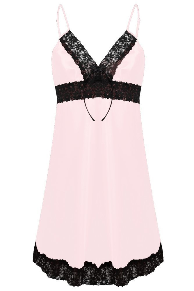Efektowna koszulka damska z delikatnej i przyjemnej dla ciała satyny na cienkich ramiączkach. Z pozoru prosta, lecz tak naprawdę jest bardzo wyrafinowaną bielizną. Miseczki, pas pod biustem i dół koszulki ozdobione elegancką czarną koronką. Na łączeniu miseczek znajduje się satynowa kokardka. Skład: 100% poliester.