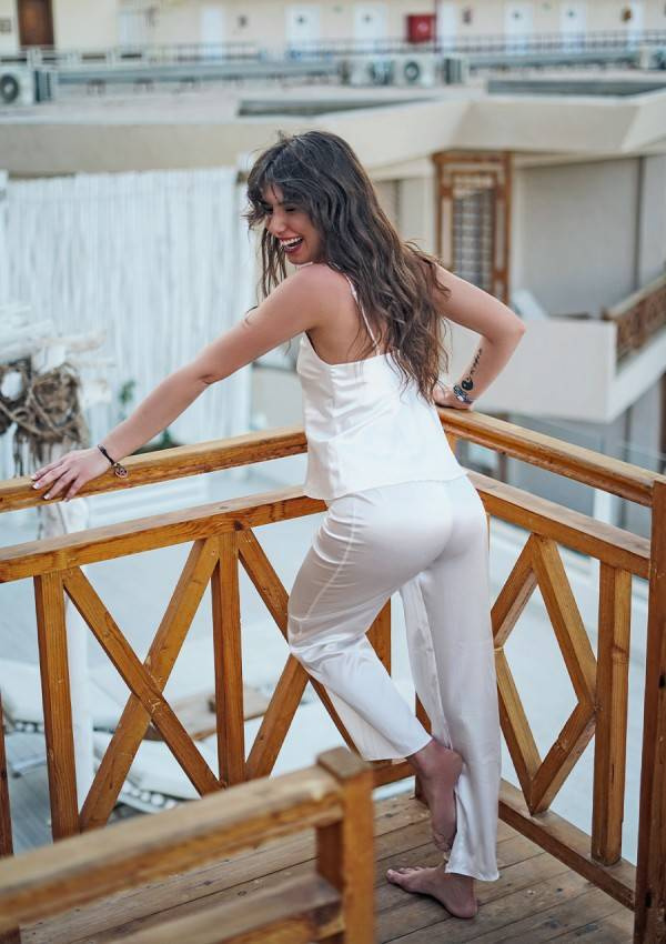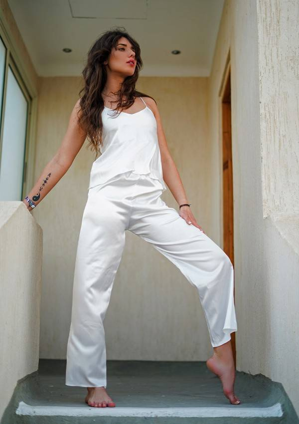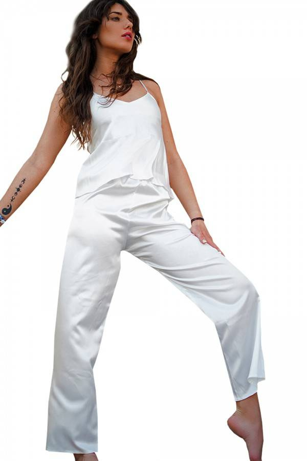 Do kompletu długie spodnie satynowe na cienkiej gumce.