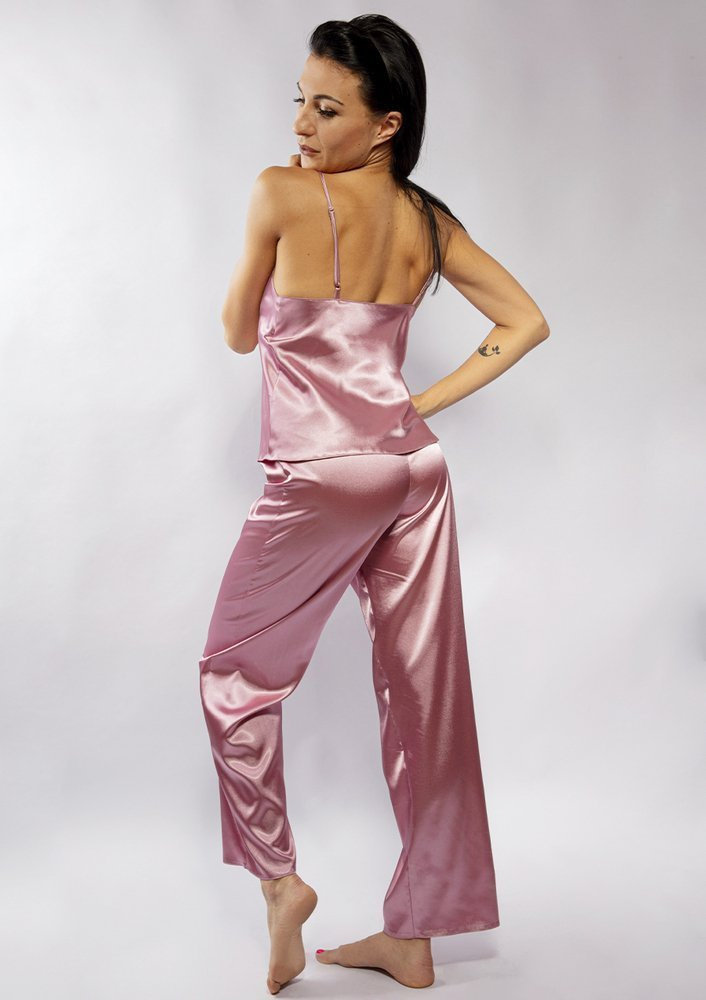 Do kompletu długie spodnie satynowe na cienkiej gumce.