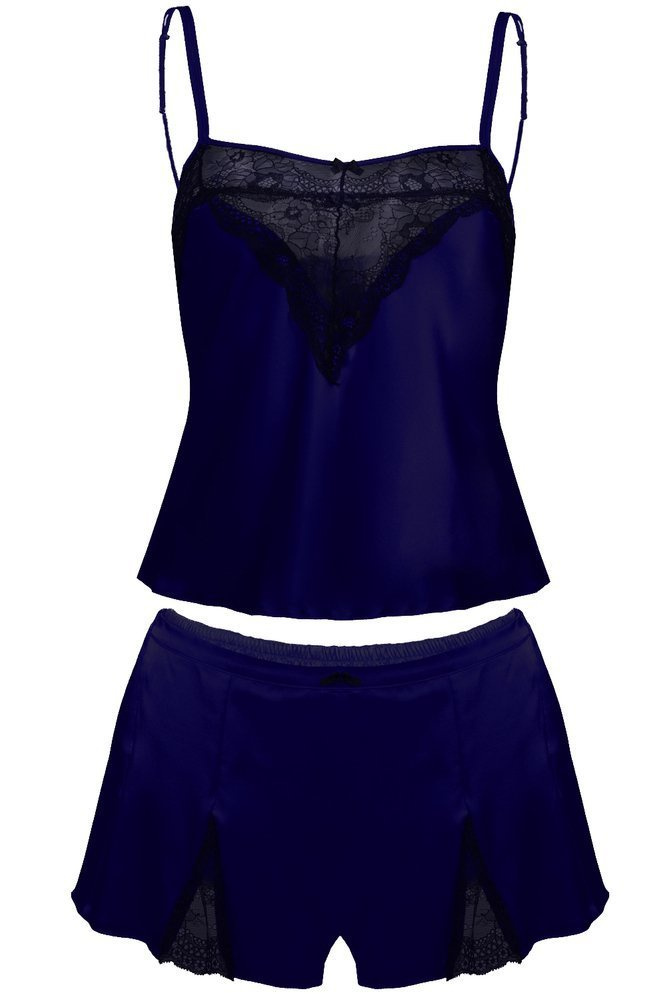 Satynowy komplecik w który skład wchodzi koszulka oraz spodenki. Górę koszulki zdobi delikatna, zmysłowa koronka na dekolcie.