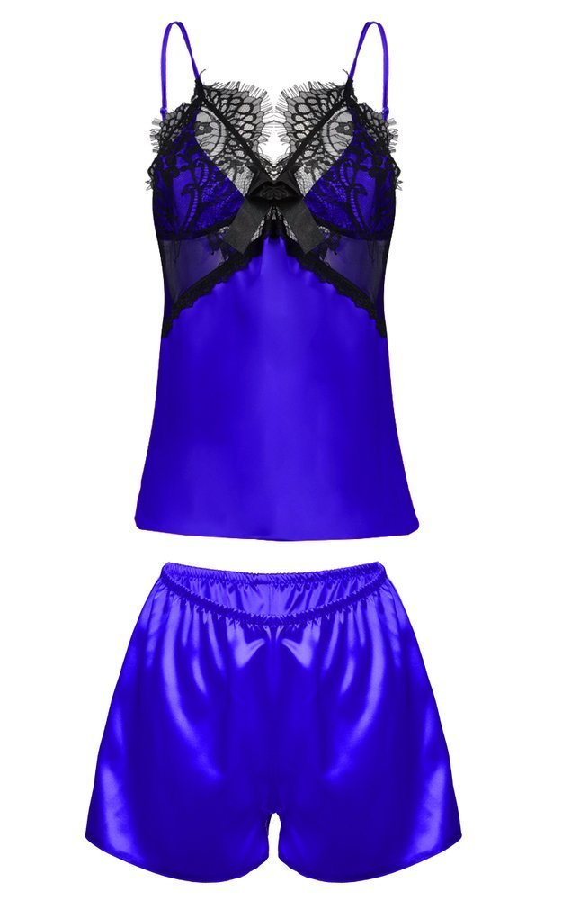 Uwodzicielski komplecik satynowy składający się z dwóch części. Góra koszulki jest uszyta z przepięknej koronki. Miseczki są podszyte satyną która kryje kobiece atuty. Dół i tył koszulki wykończony satyną. Spodenki uszyte z delikatnej satyny. Ramiączka cienkie regulowane.