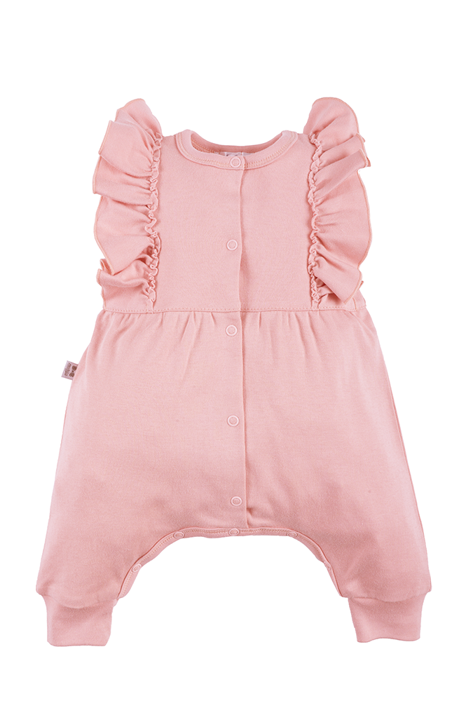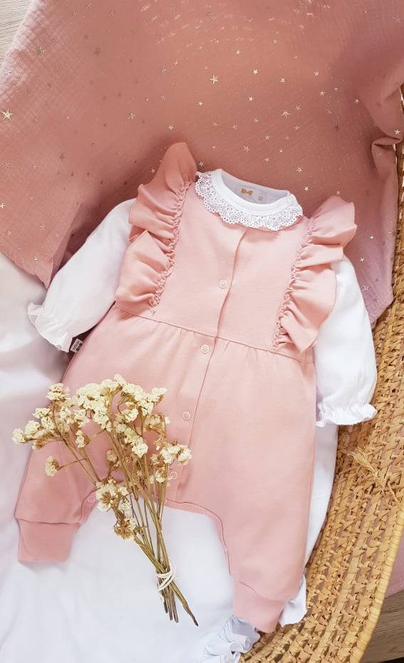 Uroczy, dziewczęcy pajacyk w kolorze pudrowego różu. Wykończony falbanką. Wykonany z bawełny 100% dzięki czemu jest delikatny dla skóry maluszka. W całości rozpinany co ułatwia ubieranie dziecka.