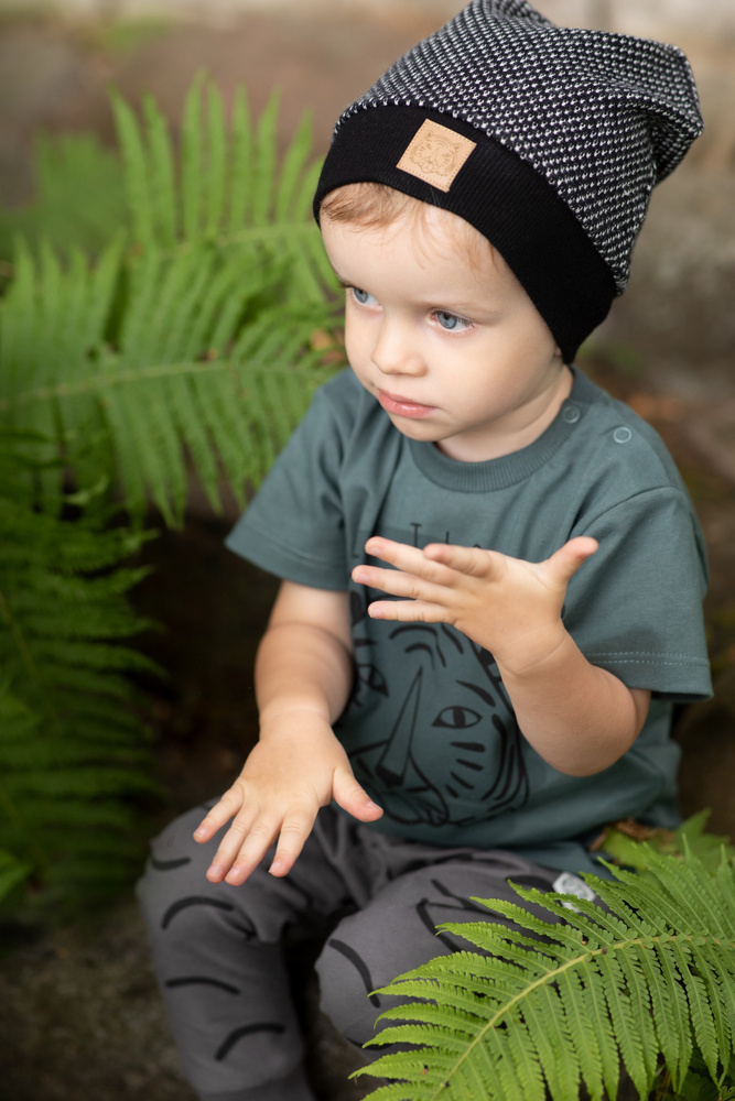 T-shirt dziecięcy z ozdobnym nadrukiem. Bezpieczna metoda farb wodnych sprawia, że nadruki są trwałe, nawet po wielu praniach.