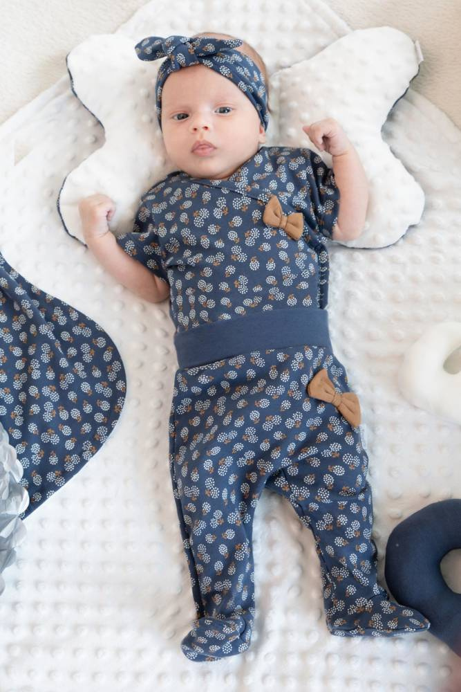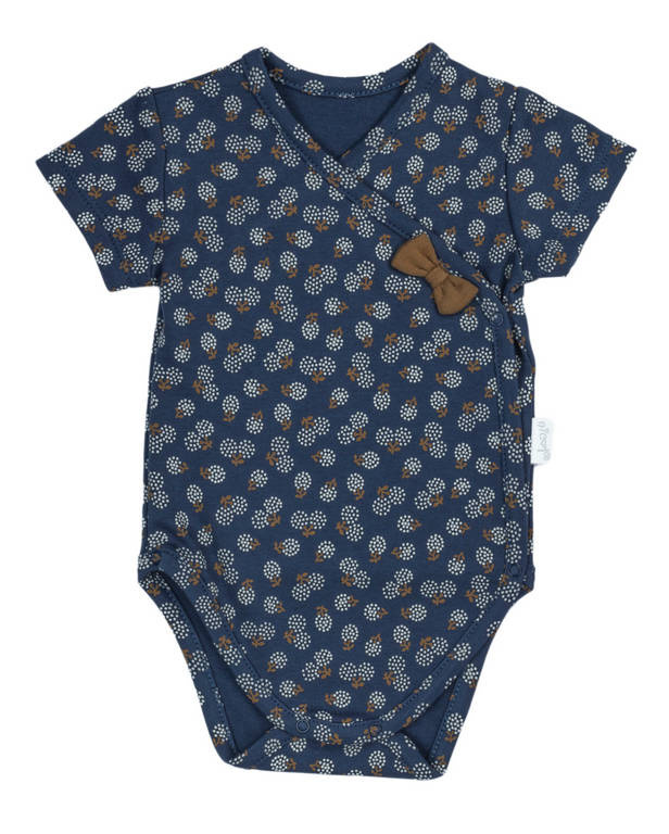 Przewiewne body z krótkim rękawem, idealne w ciepłe dni, uszyte z granatowej bawełny z dodatkiem kwiecistych wzorków, posiadającej certyfikat Oeko-Tex Standard 100 Tekstylia godne zaufania. Produkt jest zapinany z przodu, wzdłuż całego ubranka na bezniklowe napy. Dodatkowo model zdobi brązowa kokardka.