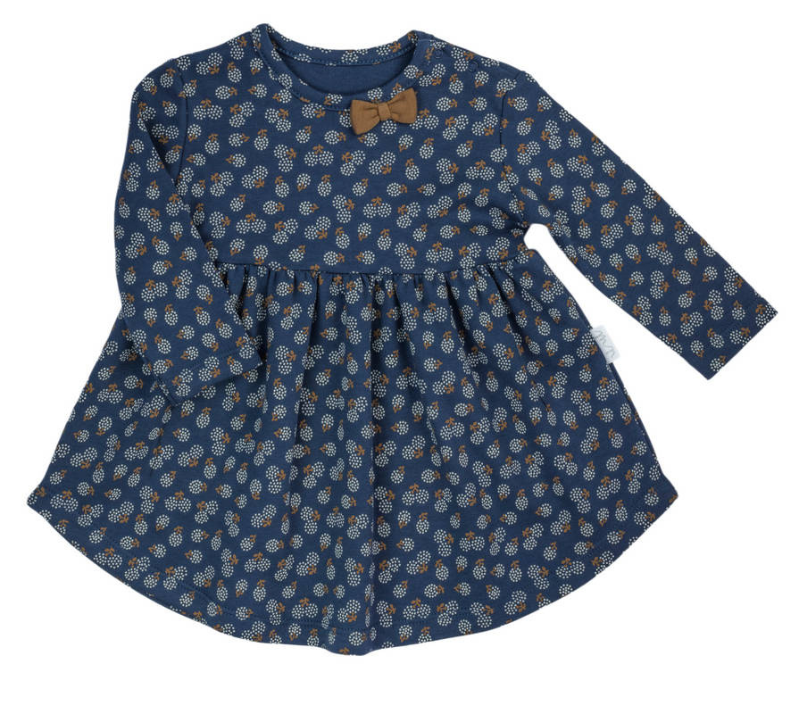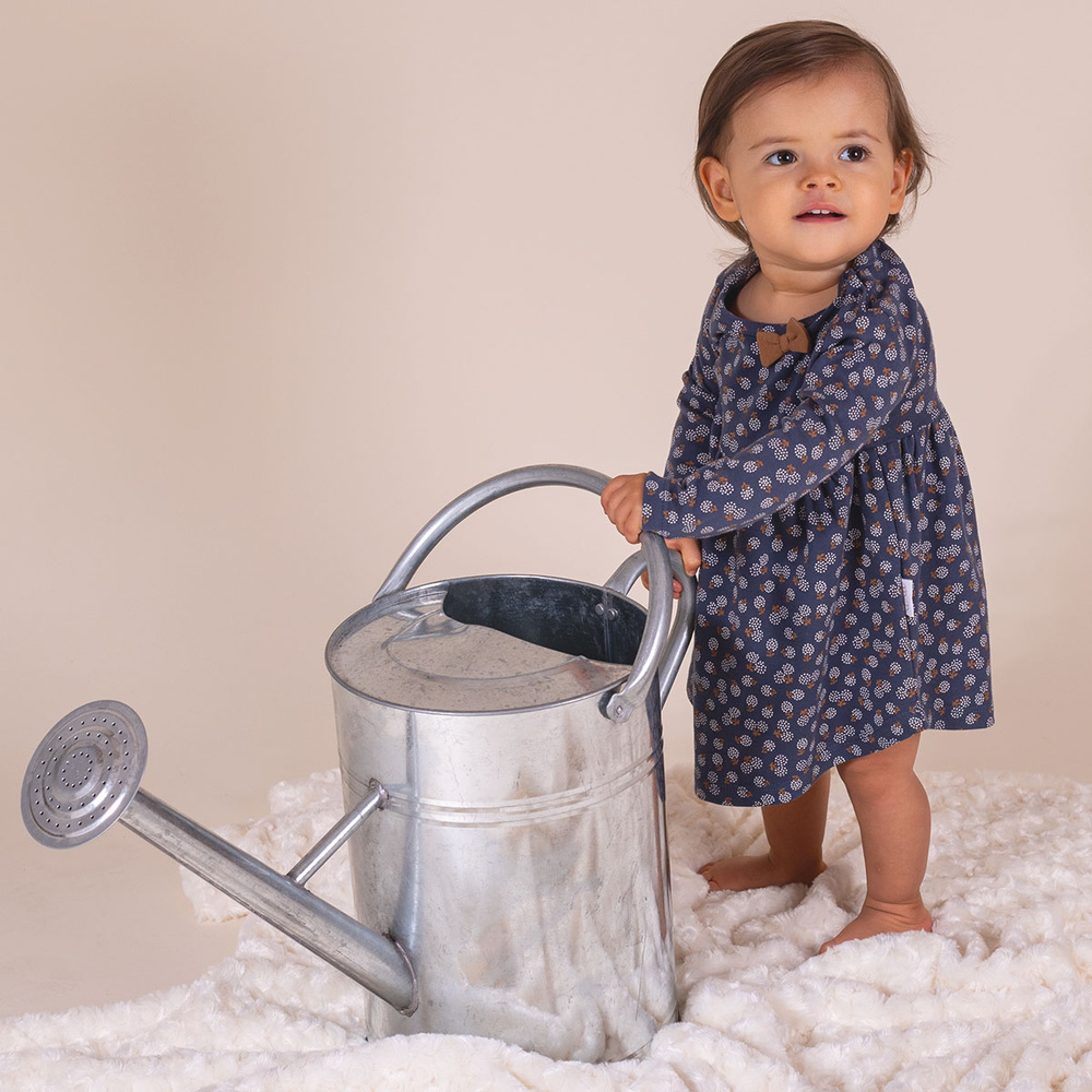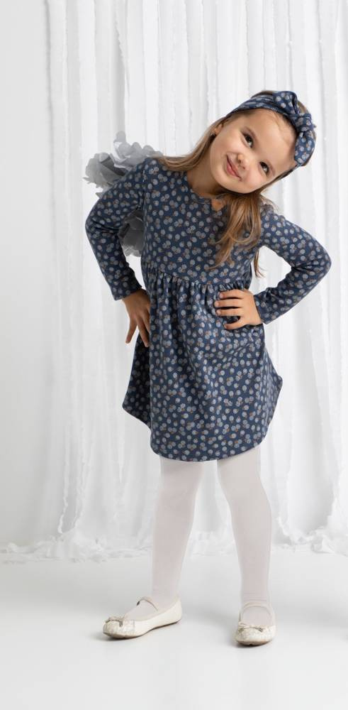 Modna sukienka wykonana z granatowej bawełny z kwiecistymi dodatkami. Dziewczęcego oraz zwiewnego charakteru temu produktowi dodaje gumka, która została wszyta w pasie. Materiał jest całkowicie bezpieczny dla skóry dziecka.
