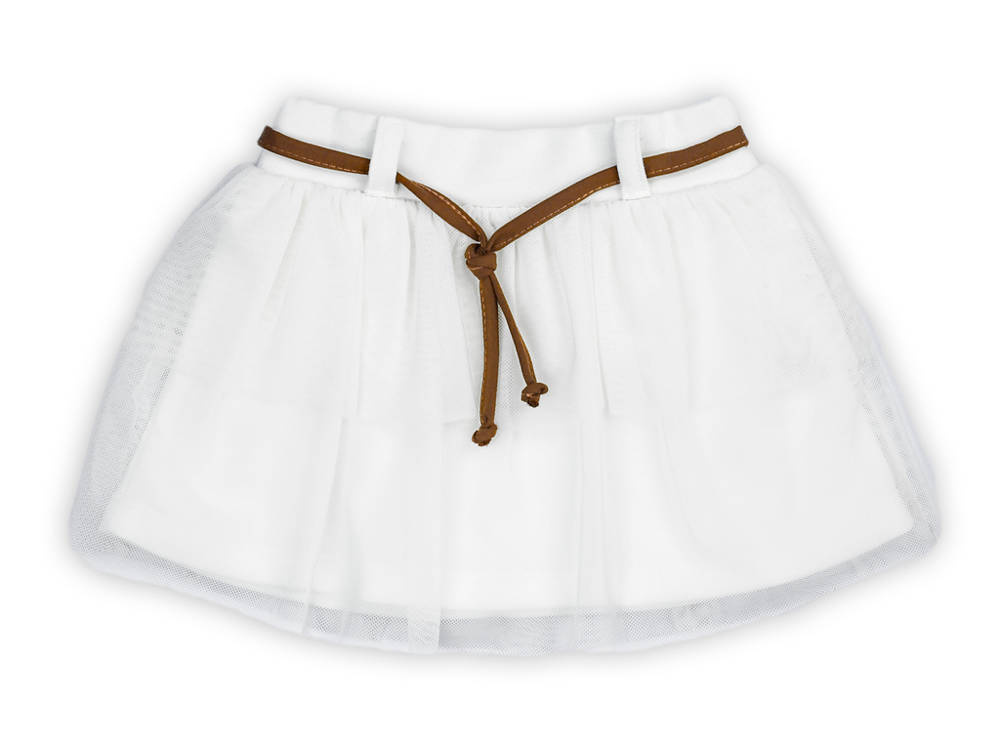 Nie krępująca ruchów, wygodna spódniczka w kolorze kremowym, do której dodatkowy od zewnętrznej strony został doszyty tiul. Brązowy sznureczek w pasie dodaje jej uroku. Wykonana z bawełny posiadającej certyfikat Oeko-Tex Standard 100 Tekstylia godne zaufania. W pasie wszyto praktyczną gumkę, ułatwiającą ubieranie.