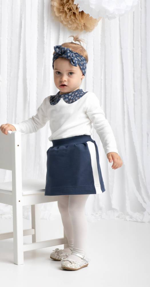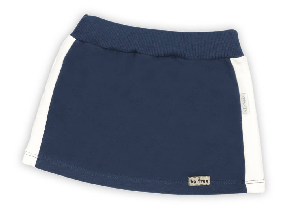 Prosta, delikatna spódniczka dla dziewczynki wykonana z materiału granatowego z kremowymi przeszyciami. W pasie została wszyta szeroka guma, który ma zapobiec okręcaniu się ubranka. Produkt zdobi eko skórka.