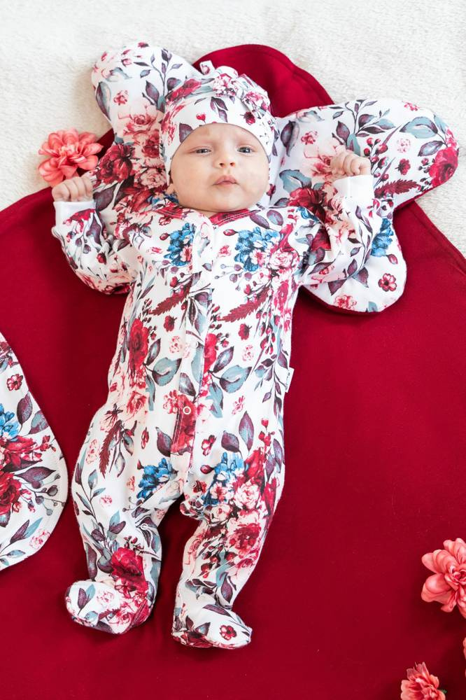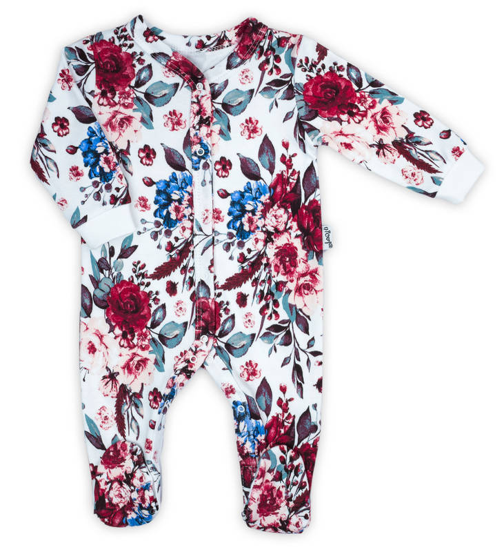 Bawełniany pajac niemowlęcy w wzorki. Pajac rozpinany jest na całej długości na bezniklowe zatrzaski. To bardzo ułatwia przebieranie lub przewijanie dziecka. Anatomiczny krój oraz wszyty w kroku klin sprawia, że ubranko nie krępuje ruchów maluszka podczas snu.