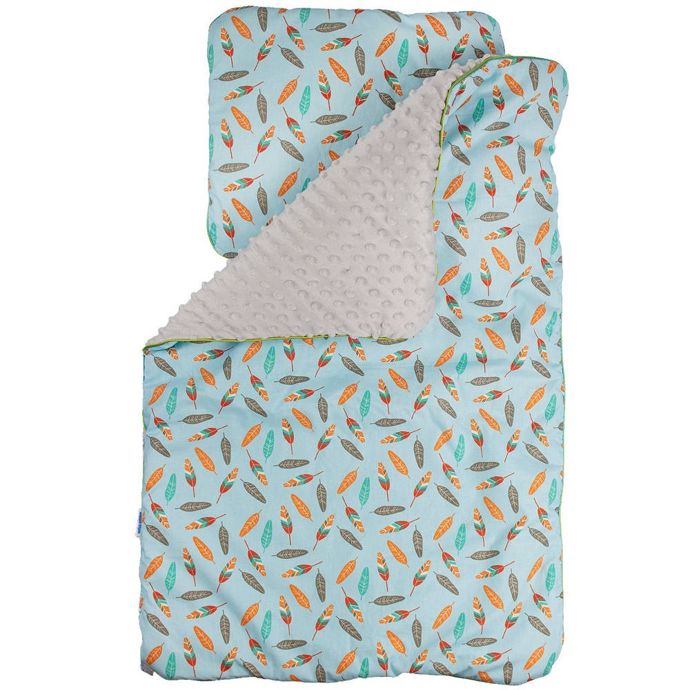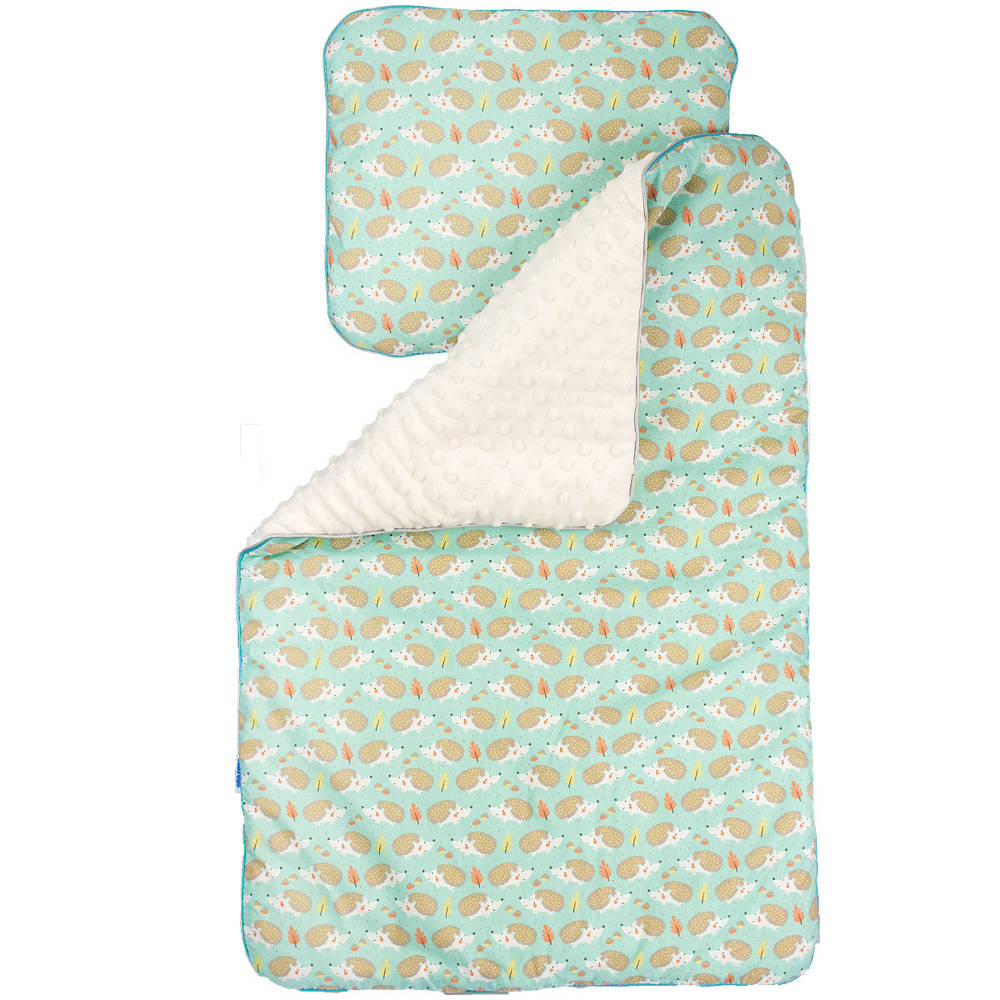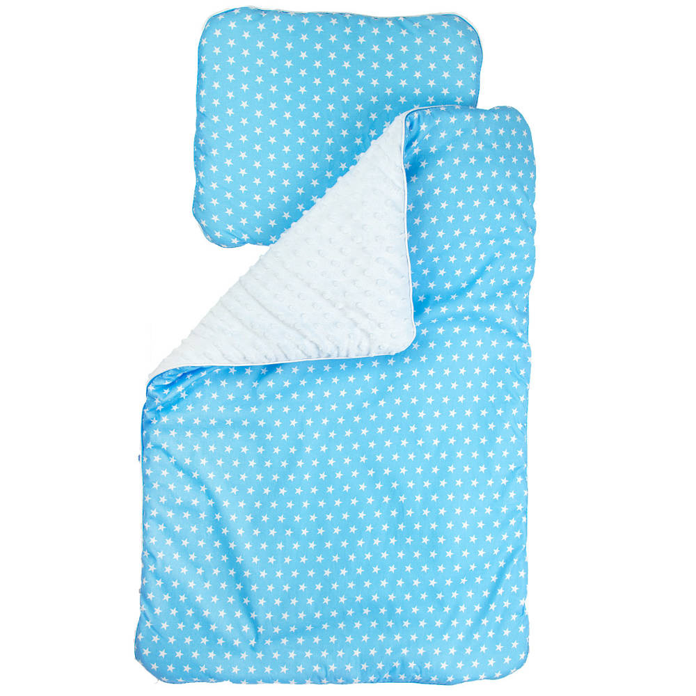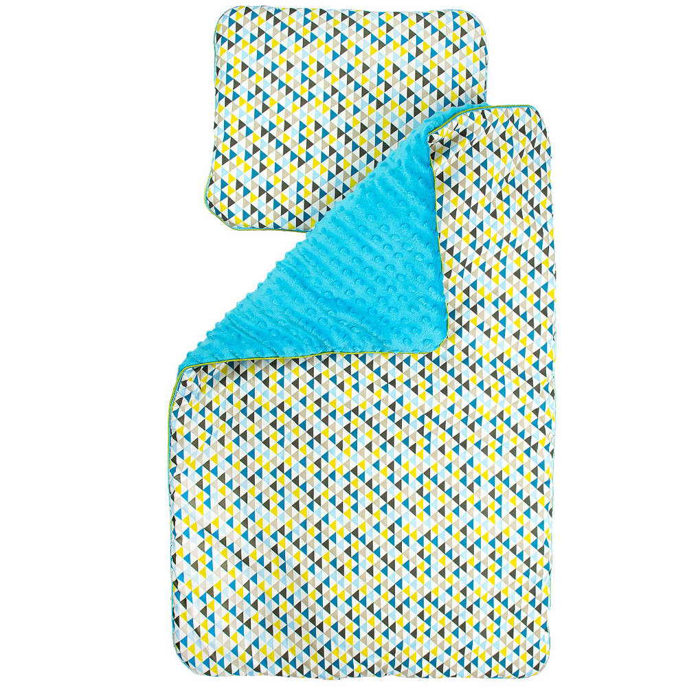 Kolorowy, ocieplany kocyk z minky połączony z kolorową 100% bawełną. Wypełniony jest antyalergiczną włókniną. Komplet ten doskonale sprawdzi się do wózka. Prać można w 30 st. nie wolno suszyć w suszarkach bębnowych, prasować tylko po stronie bawełny. Kocyk ma wymiary 50/75cm Gramatura minky to 350g. Poduszka o wymiarach 30/35 cm wypełniona antyalergiczną włókniną.