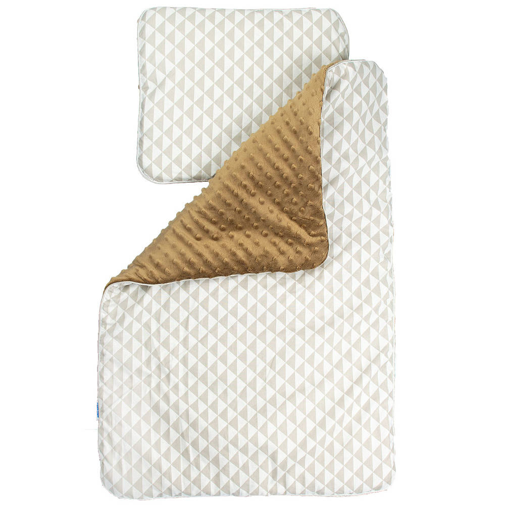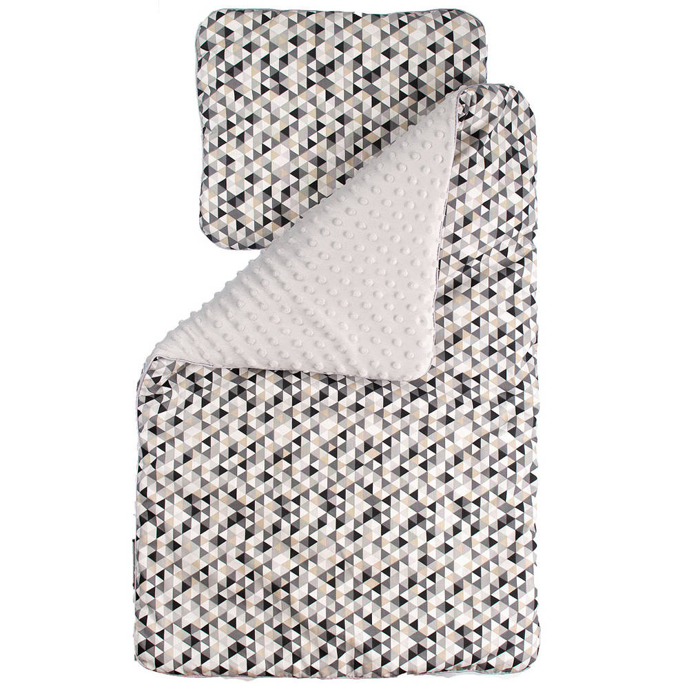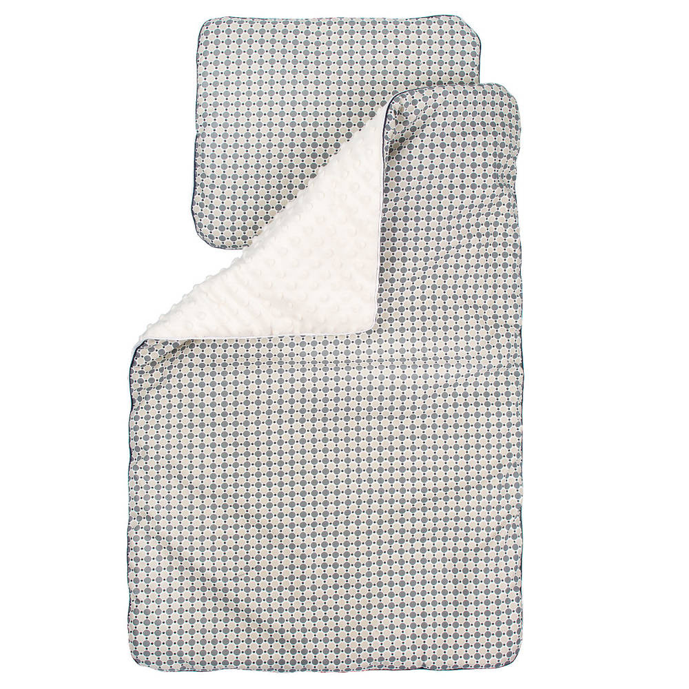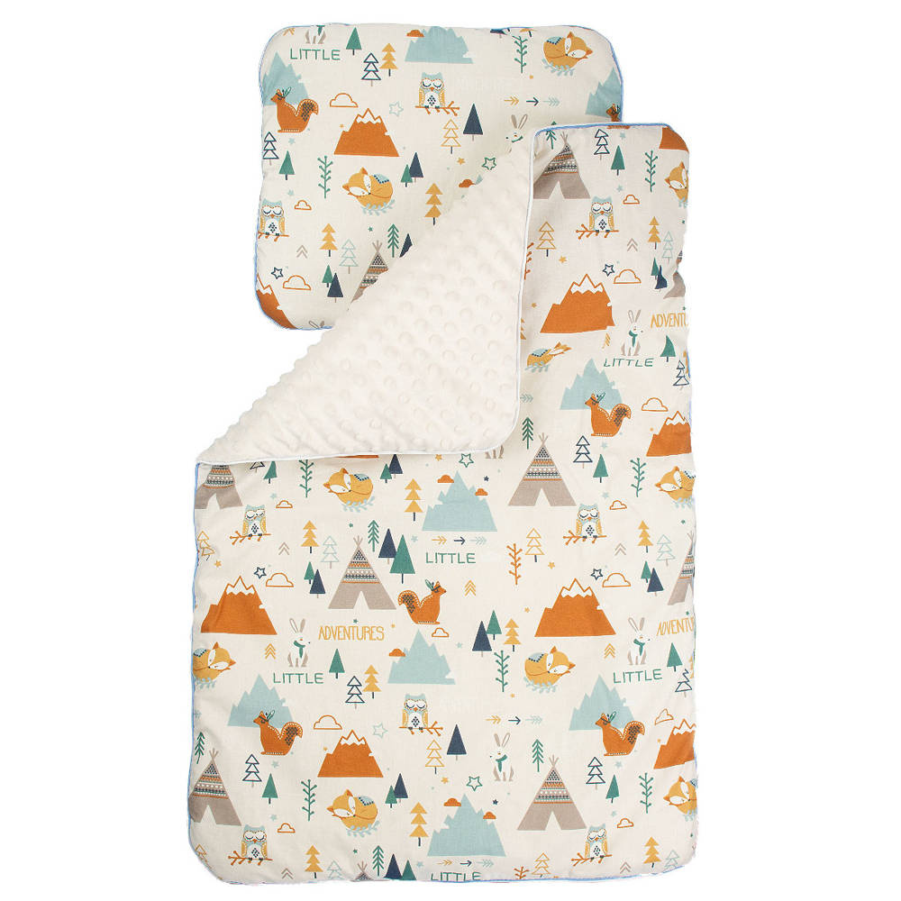 Kolorowy, ocieplany kocyk z minky połączony z kolorową 100% bawełną. Wypełniony jest antyalergiczną włókniną. Komplet ten doskonale sprawdzi się do wózka. Prać można w 30 st. nie wolno suszyć w suszarkach bębnowych, prasować tylko po stronie bawełny. Kocyk ma wymiary 50/75cm Gramatura minky to 350g. Poduszka o wymiarach 30/35 cm wypełniona antyalergiczną włókniną.
