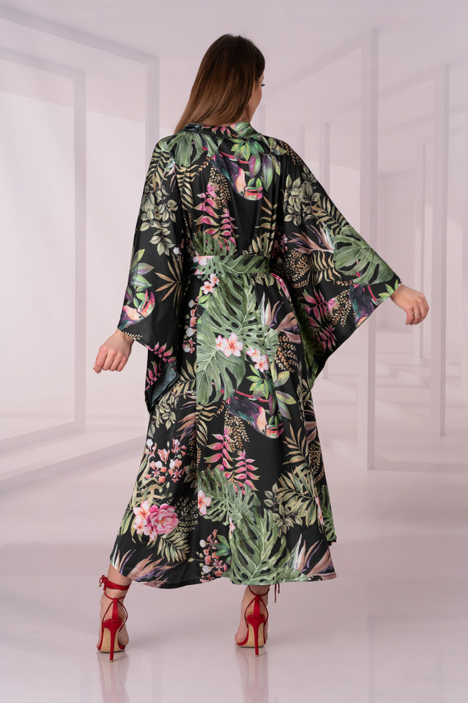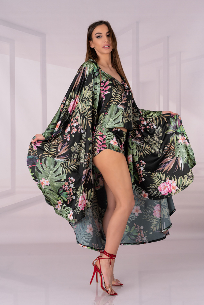 Szlafrok został zaprojektowany tak, by zakrywał niedoskonałości i eksponował atuty figury. Wiązany w talii grubą szarfą szlafrok został uszyty z przewiewnej tkaniny. Miękki i miły w dotyku materiał. Czarny materiał został ozdobiony oryginalnym wzorem, przedstawiającym motywy roślinne. Brzegi tkaniny zabezpieczono przed pruciem przez podwinięcie i podszycie materiału, co pozwoliło uzyskać eleganckie wykończenie. Kopertowy krój szlafroka sprawia, że można w prosty sposób regulować głębokość dekoltu. Wygodne, szerokie rękawy nie ograniczają ruchów, co zapewnia komfort i swobodę użytkowania. Szlafrok idealnie prezentuje się na każdym typie sylwetki. Połączenie subtelnej zmysłowości ze stylową oryginalnością.
