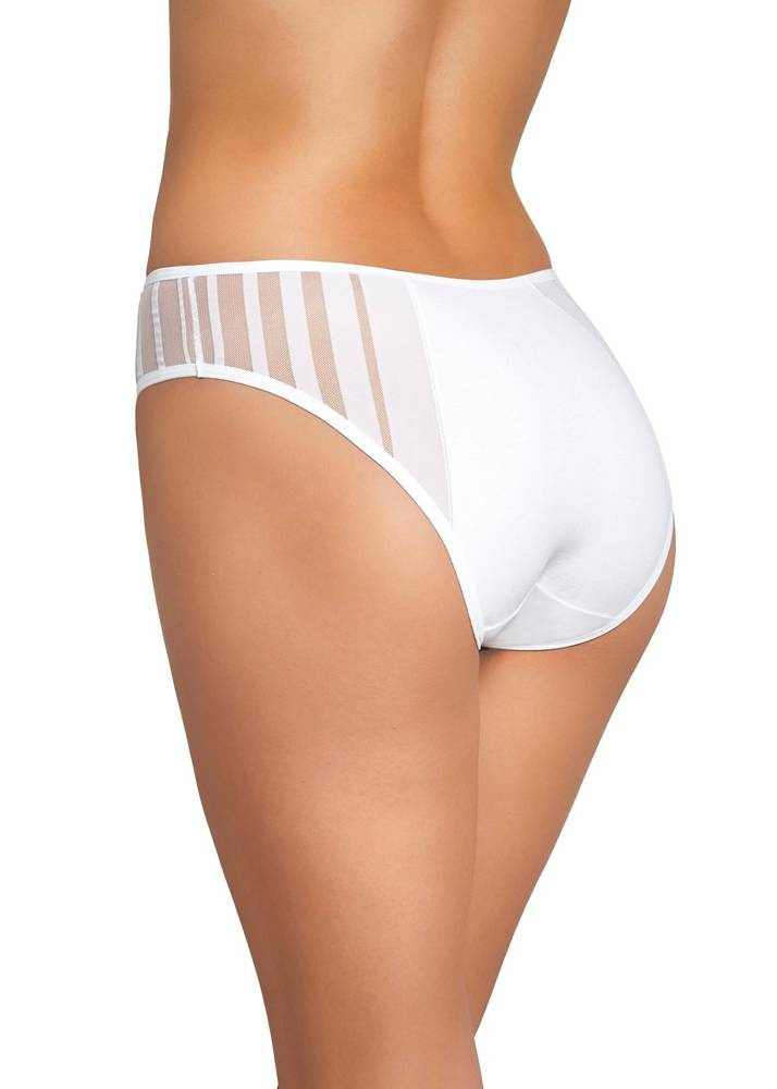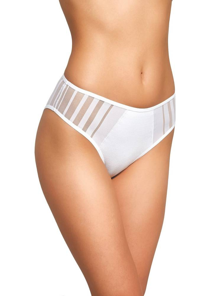 Efektowne bawełniane figi damskie z wysoką linią talii, zabudowane na biodrach. Boki ozdobione siateczką w paski.