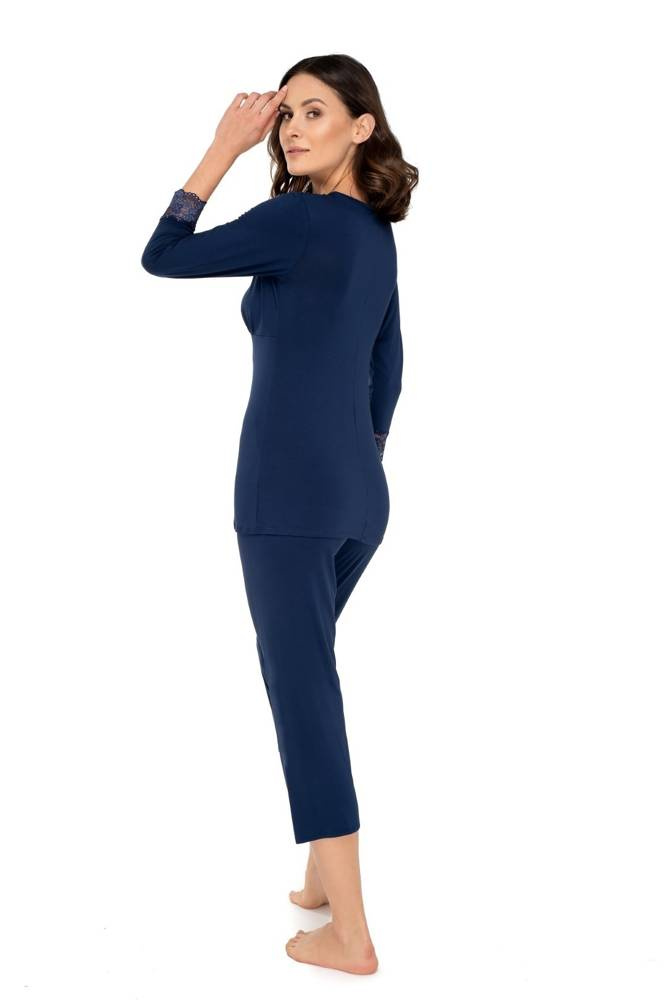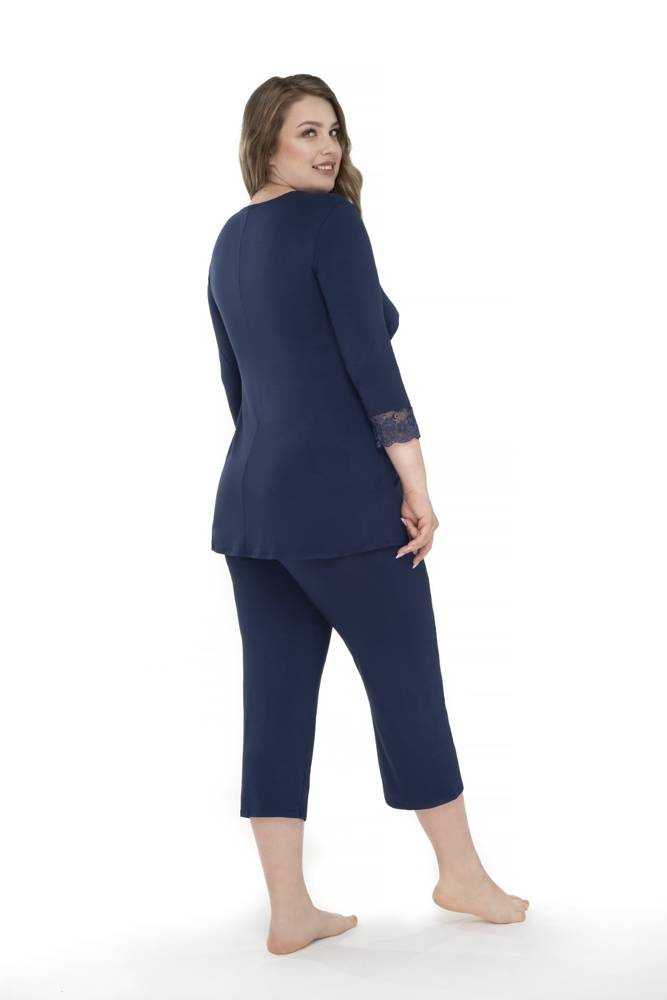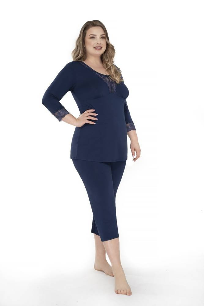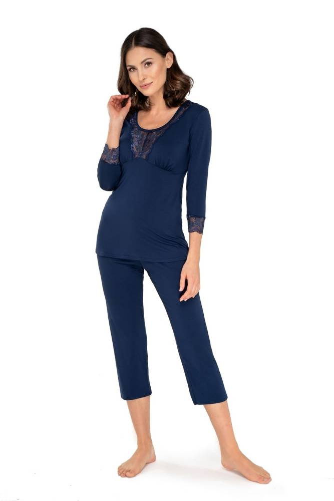 Piżama damska wykonana z wysokiej jakości wiskozy. Bluzeczka z rękawem 7/8. Dekolt ozdobiony efektowna koronką. Do kompletu rybaczki . Spodoba się kobietom, które uwielbiają delikatność i swobodę.
