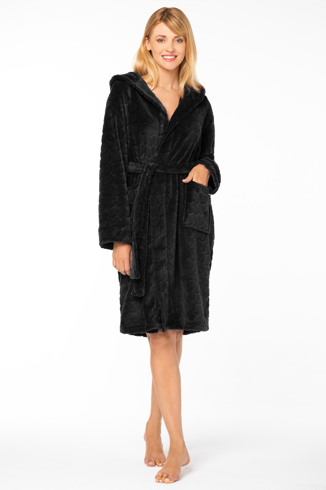Szlafrok damski uszyty z wysokogatunkowego miękkiego materiału, wiązany w pasie.