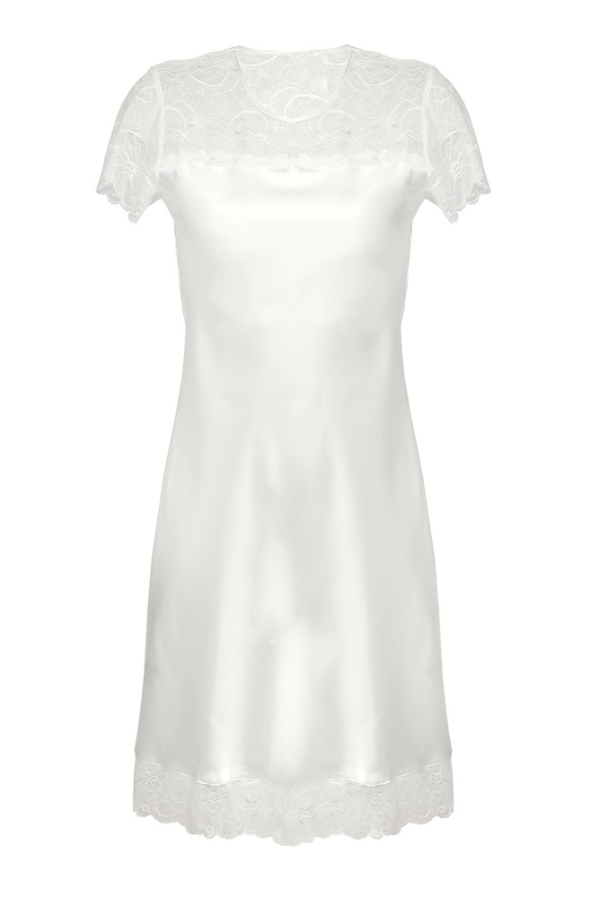 Efektowna koszulka damska z delikatnej i przyjemnej dla ciała satyny na krótkim rękawku . Z pozoru prosta, lecz tak naprawdę jest bardzo wyrafinowaną bielizną. Góra koszulki ozdobiona elegancką koronką. Idealna dla Pań które chcą ukryć swoje nie doskonałości. Koronkowe zdobienia dodają elegancji.