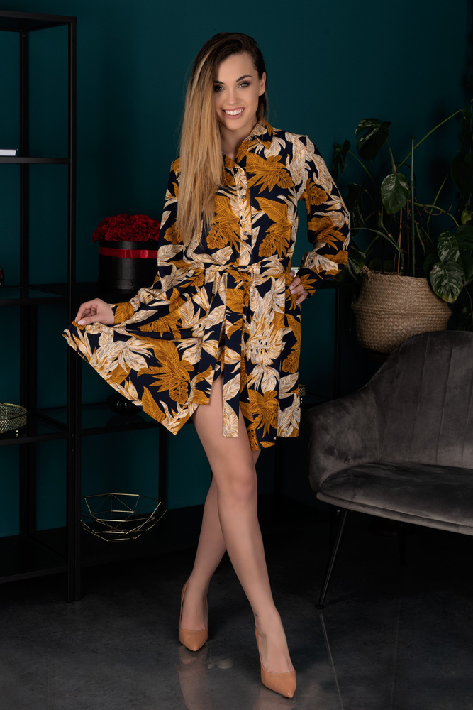 Sukienka w modnym wzorze, model z długim rękawem z paskiem w talii.