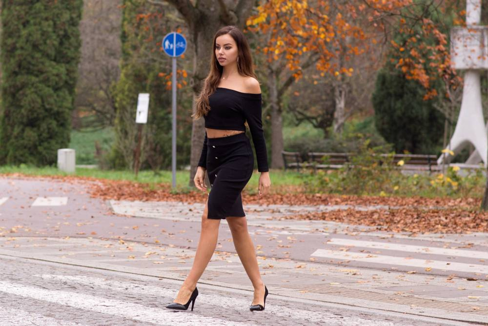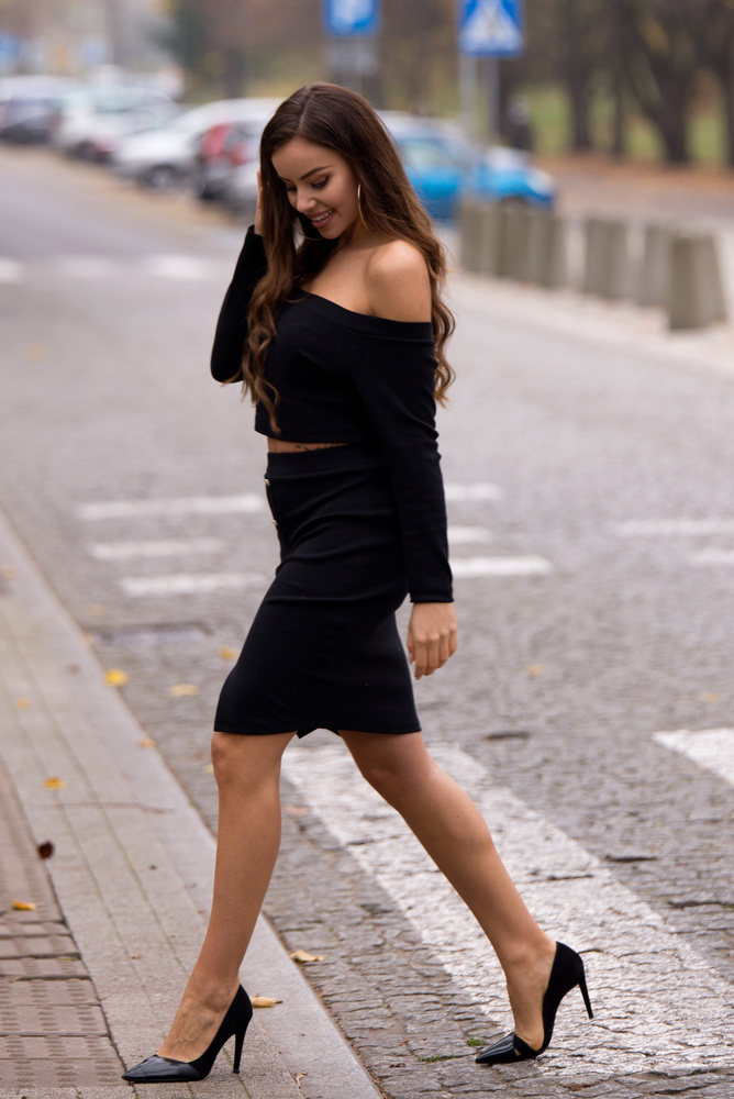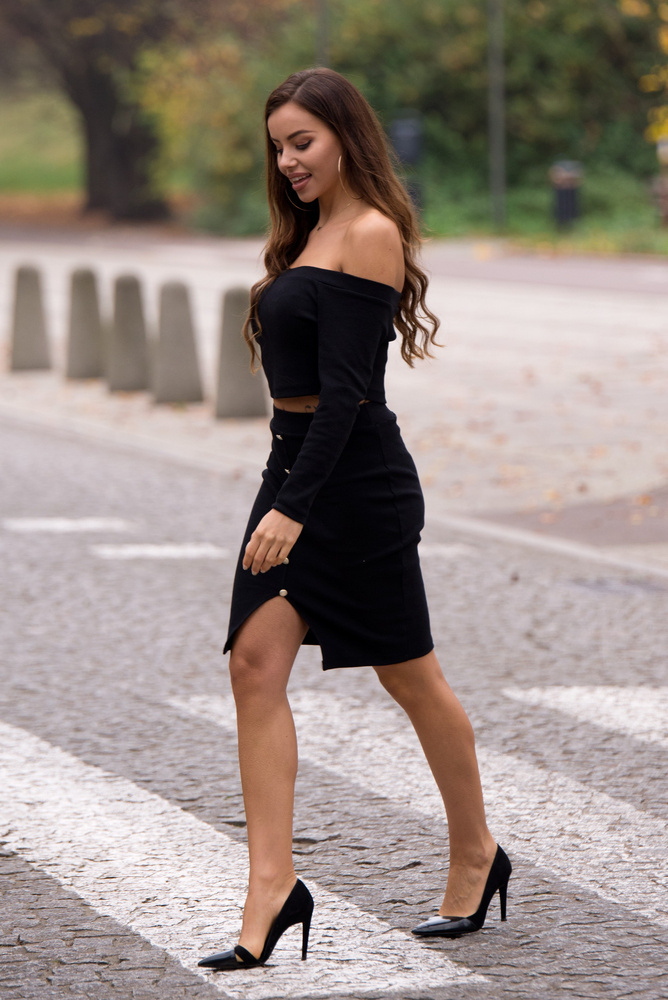 Komplet damski, w czarnym kolorze. Składa się z bluzki i spódniczki.