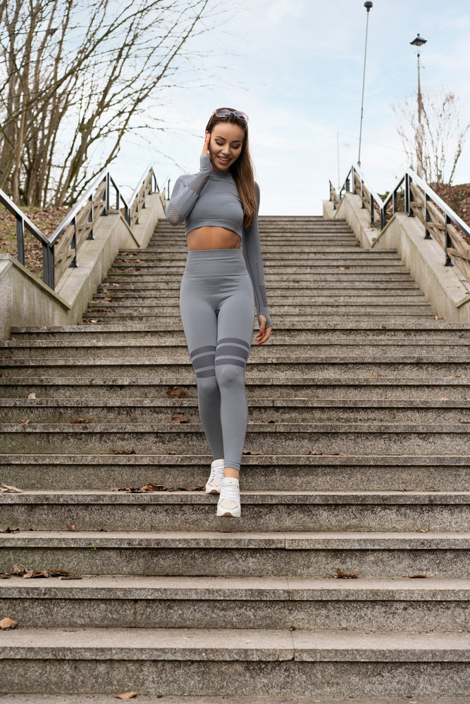Komplet damski, sportowy. Składa się z topu i legginsów.