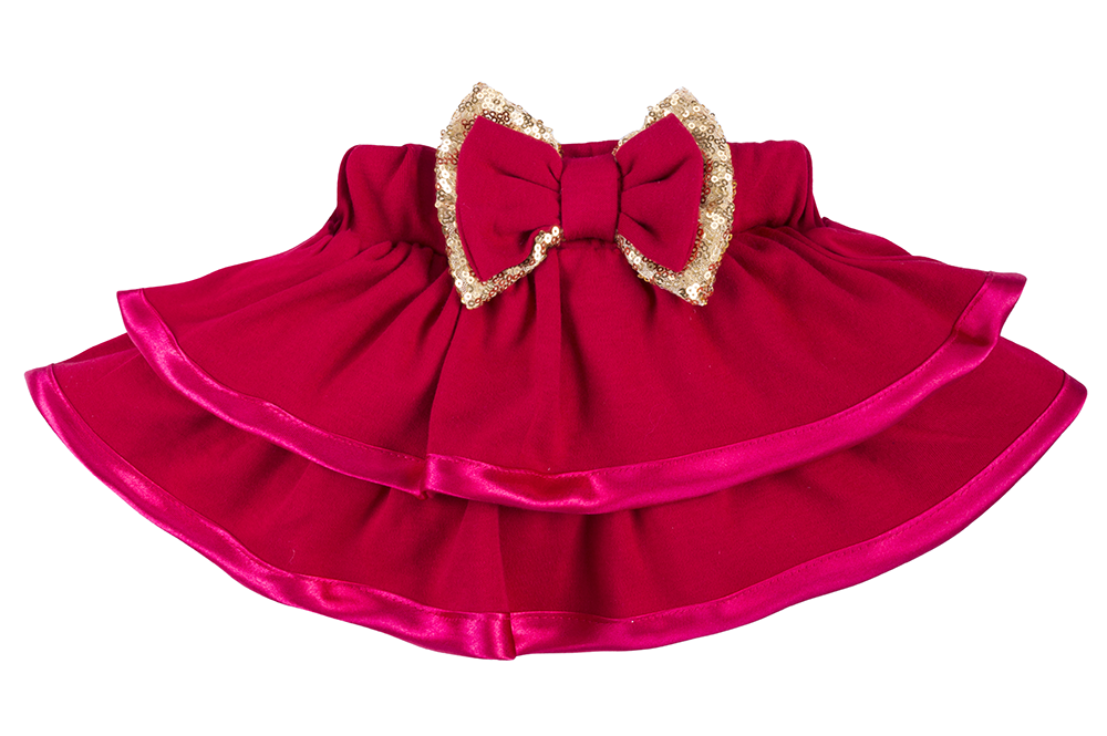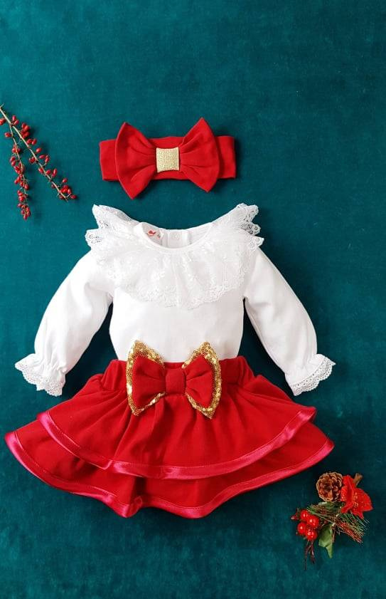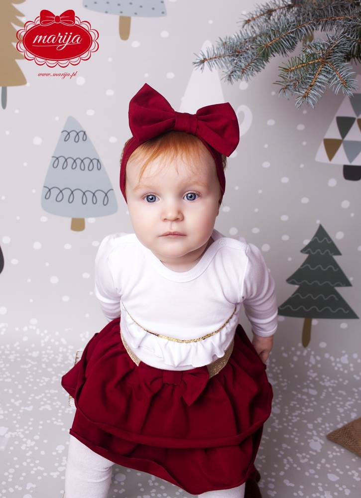 Spódniczka z kolekcji Santa składa się z dwóch nachodzących na siebie falbanek oraz szerokiej, elastycznej gumki, która utrzymuje spódniczkę. Wykończona satynową lamówką oraz dekoracyjną kokardą na przodzie. Doskonałe nadaje się na cieple dni dla małej księżniczki. Można ją połączyć z body, opaską z naszej kolekcji Santa.