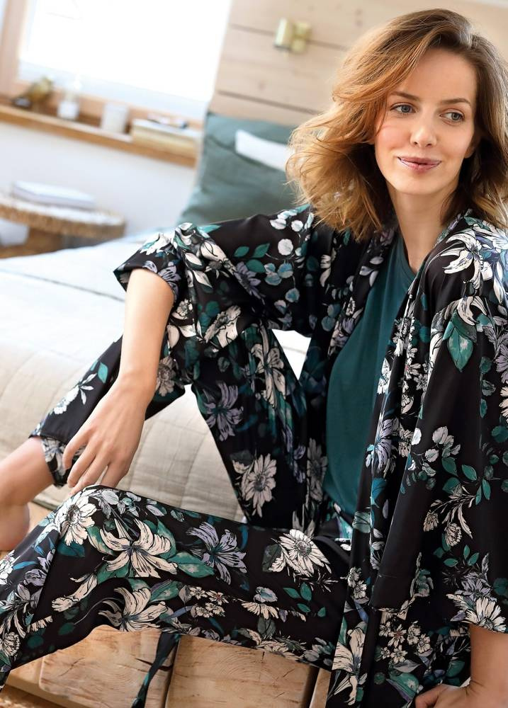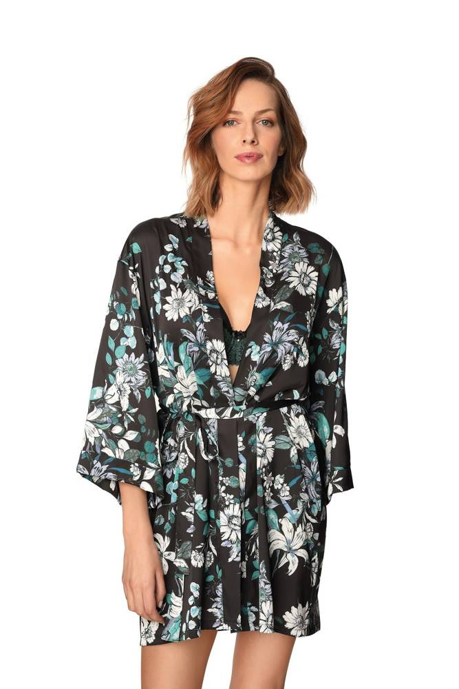 Szlafrok wykonany z wzorzystej satyny, wiązany w pasie z rękawem 7/8.