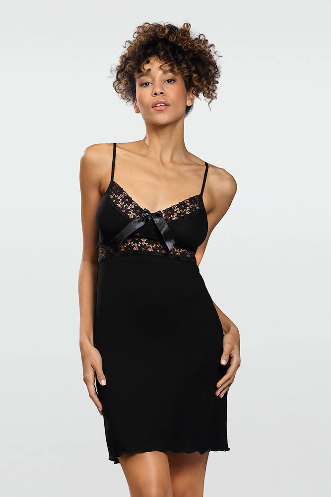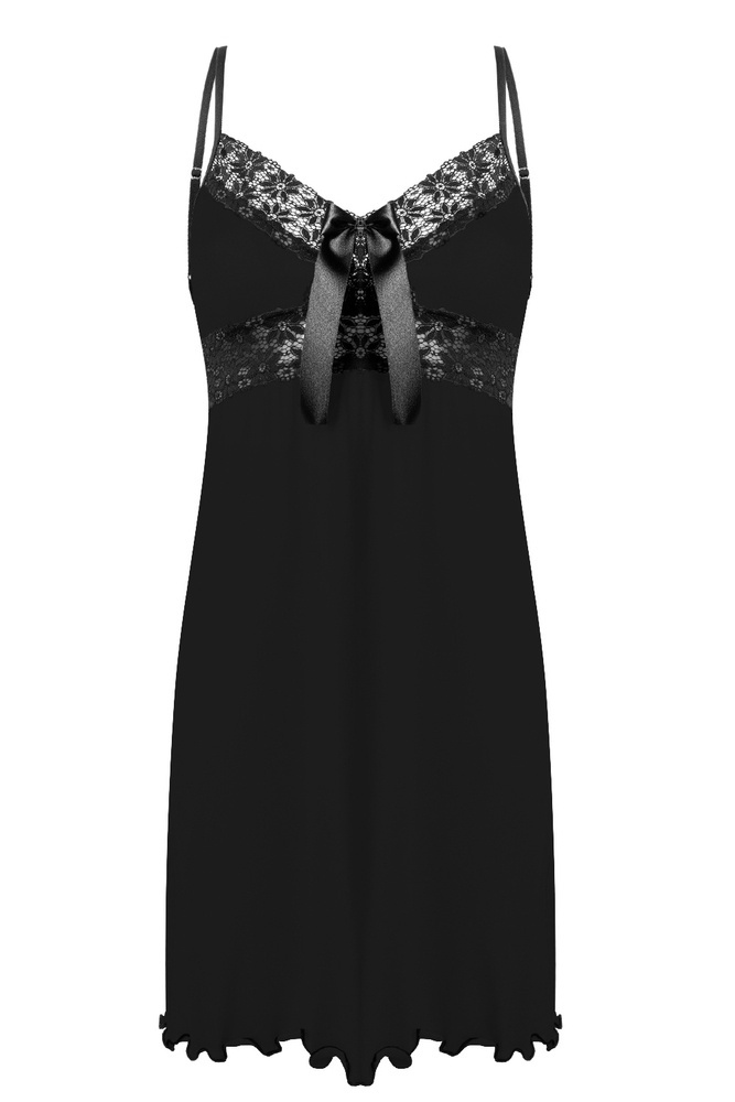 Efektowna koszulka damska z delikatnej i przyjemnej dla ciała wiskozy na cienkich ramiączkach. Z pozoru prosta, lecz tak naprawdę jest bardzo wyrafinowaną bielizną. Miseczki i pas pod biustem ozdobione elegancką czarną koronką. Na łączeniu miseczek znajduje się satynowa kokardka. Skład:  92% wiskoza, 8% elastan.