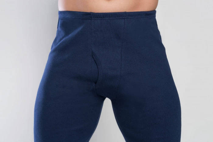 Bawełniane kalesony z funkcjonalnym rozporkiem ściągaczami na dole nogawek.