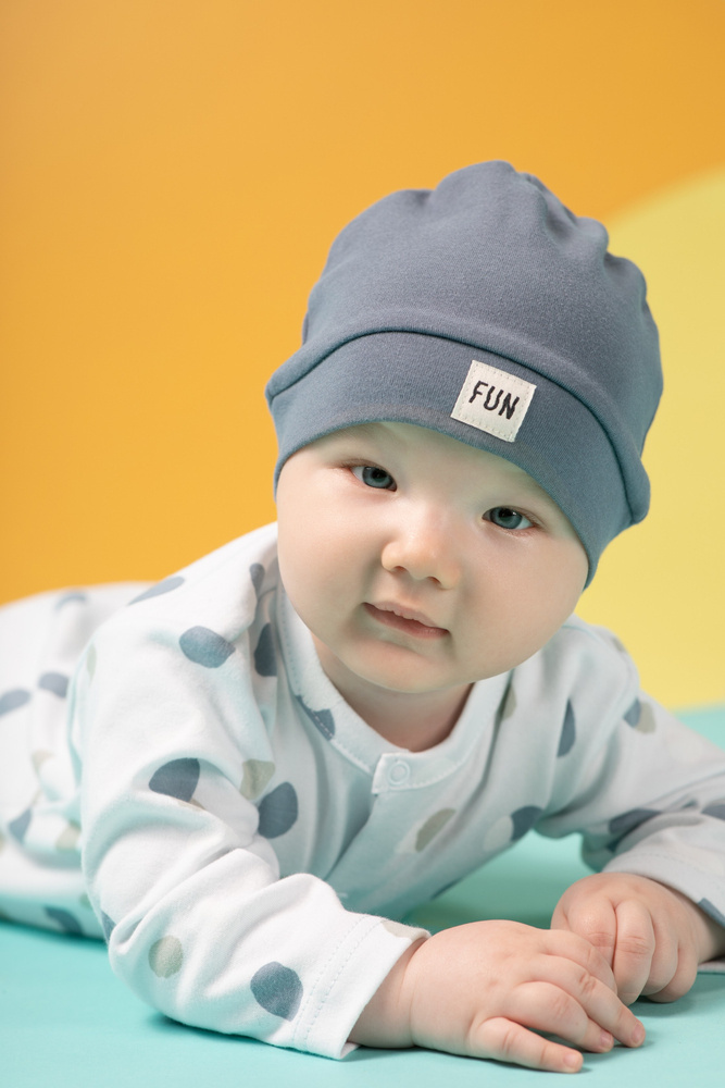 Czapka niemowlęca w modnym kolorze uszyta z bawełny.